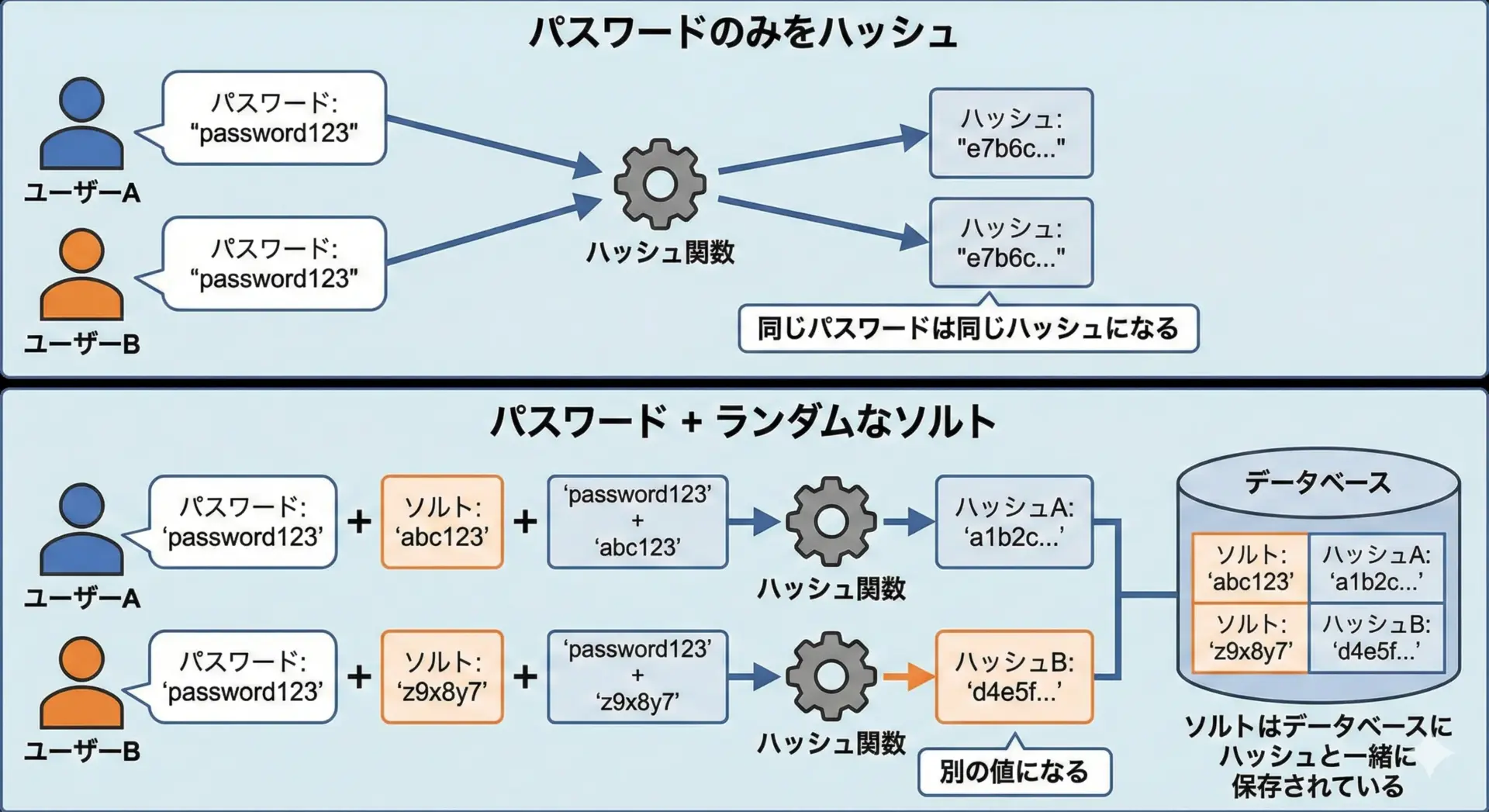 これにより、同じパスワードを使っていても、ユーザーごとにハッシュ値が異なるようになります。