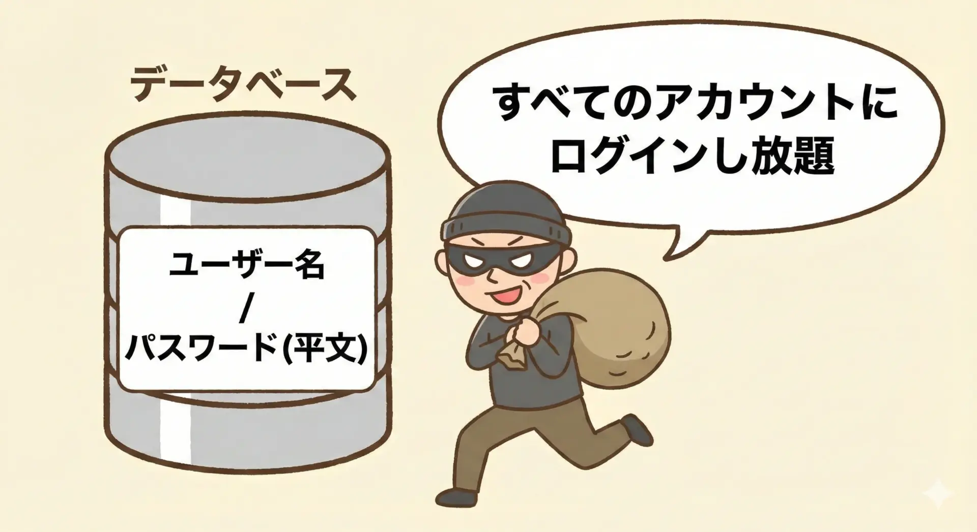 理由は明確で、もしデータベースが流出した場合、すべてのユーザーのパスワードが一瞬でバレてしまうからです。