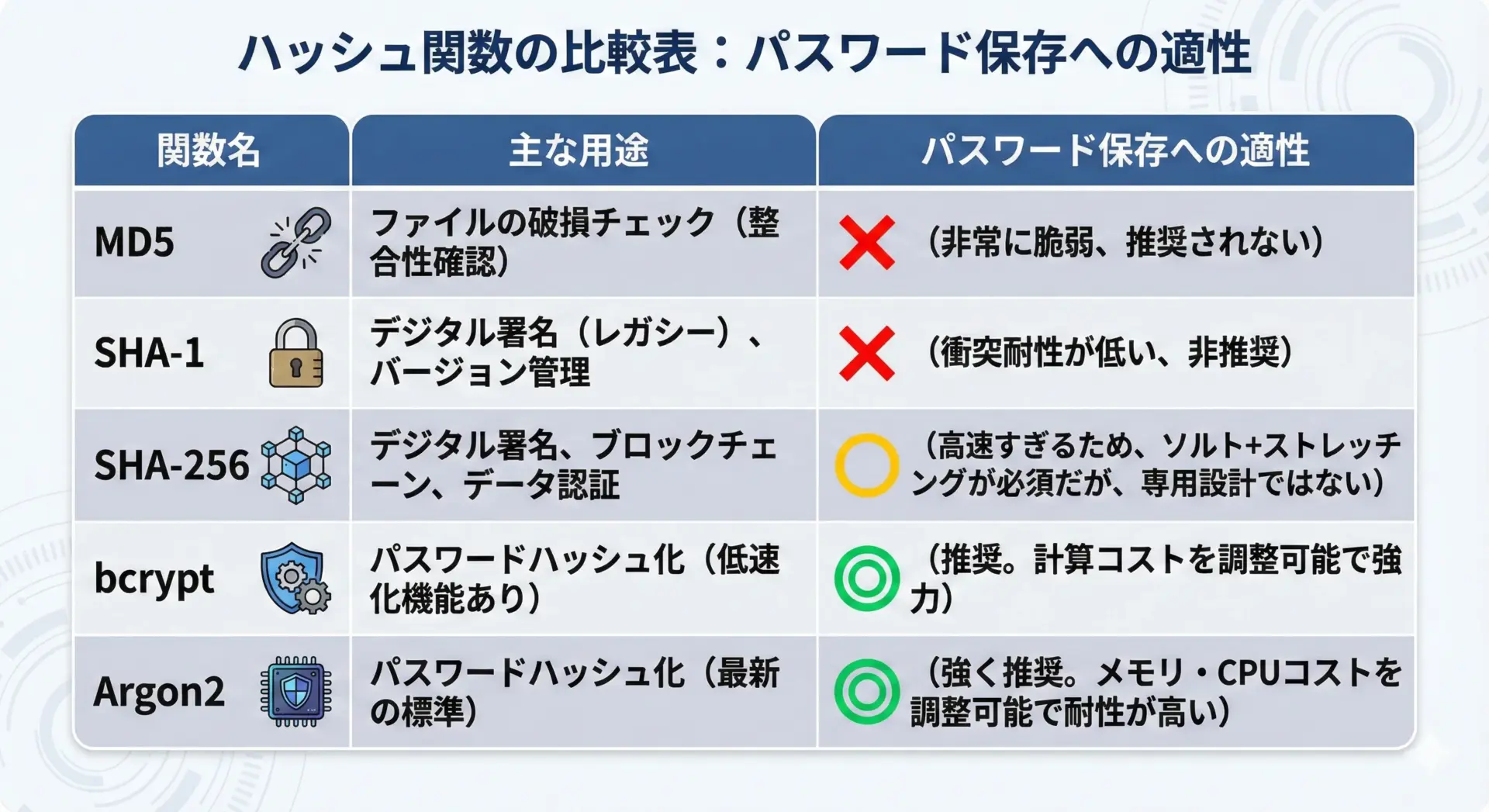 • MD5やSHA-1など古いハッシュ関数や、高速ハッシュの素朴な利用は避けるべきであること