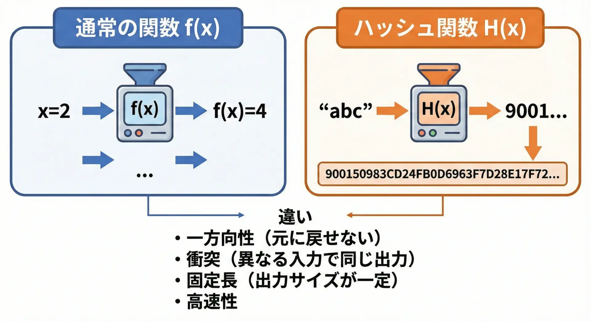 両方とも「入力に対して出力を返す」という点は同じですが、セキュリティ目的で使われるハッシュ関数には特有の性質があります。