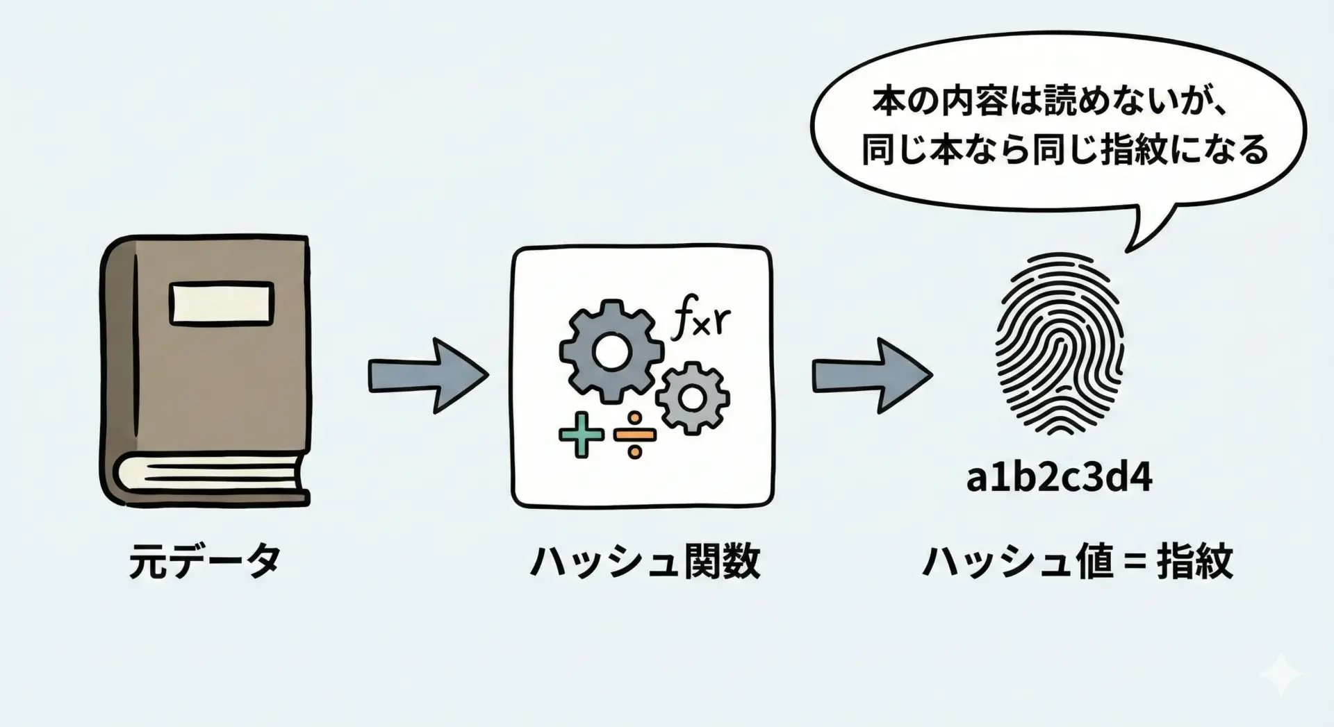 元のデータを「要約」した指紋のようなものと考えるとイメージしやすくなります。