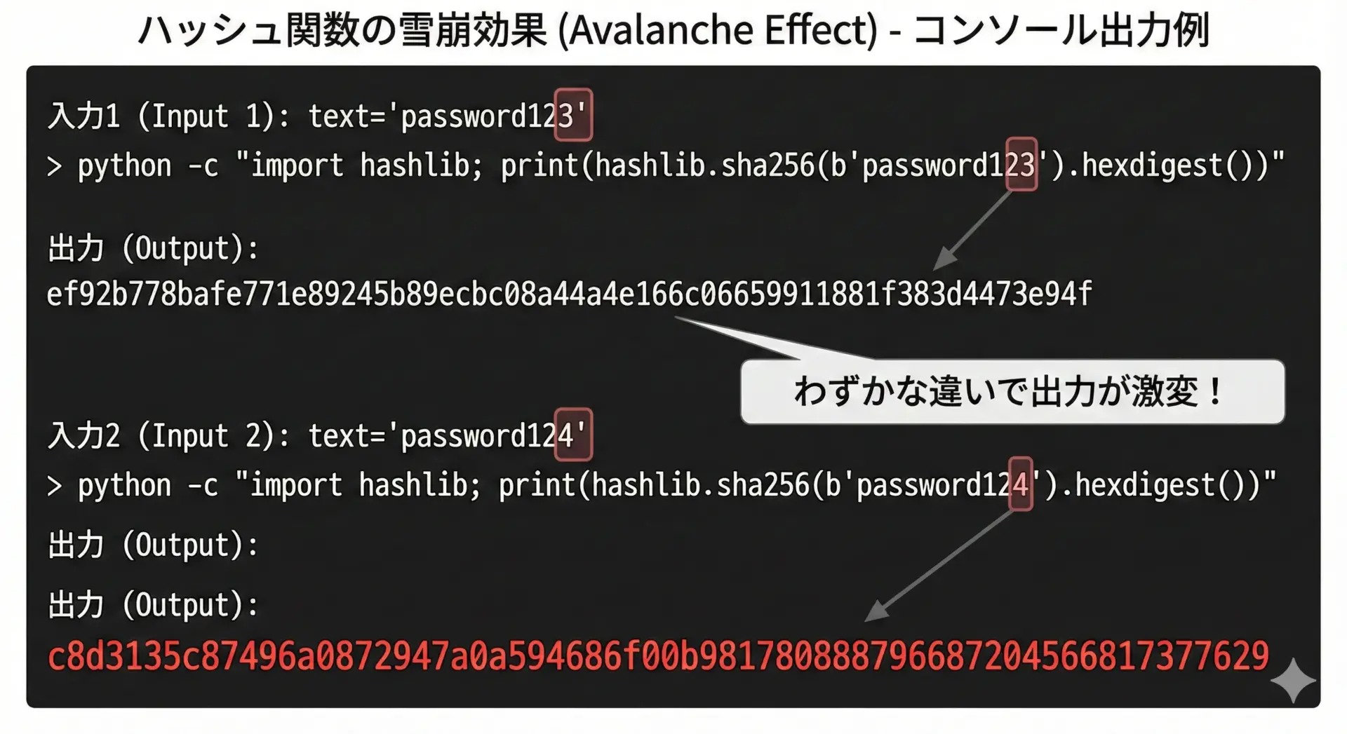 ハッシュ関数には、入力データをほんの少し変えただけでも、ハッシュ値がまったく別物のように変わるという性質があります。