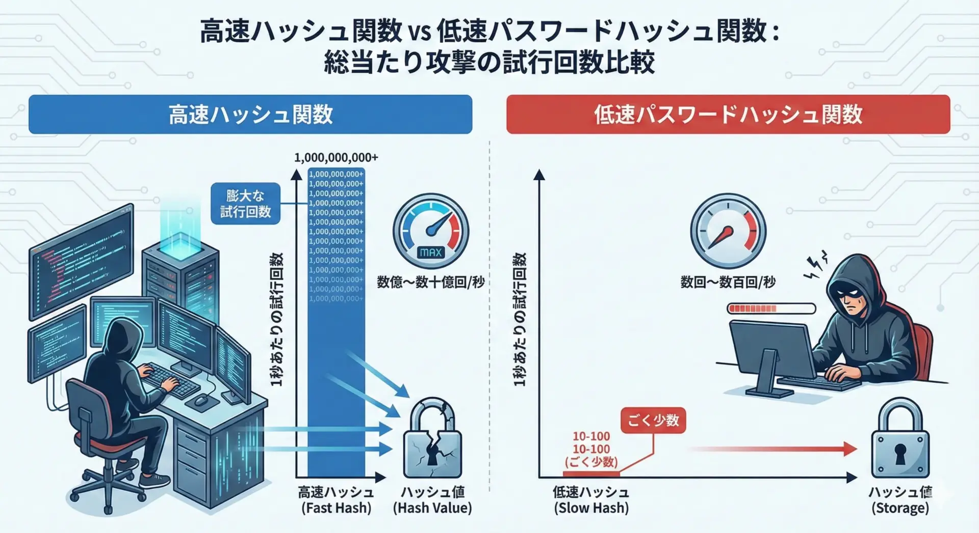 また、SHA-256のような高速なハッシュ関数も、パスワード保存に「そのまま」使うのは危険です。