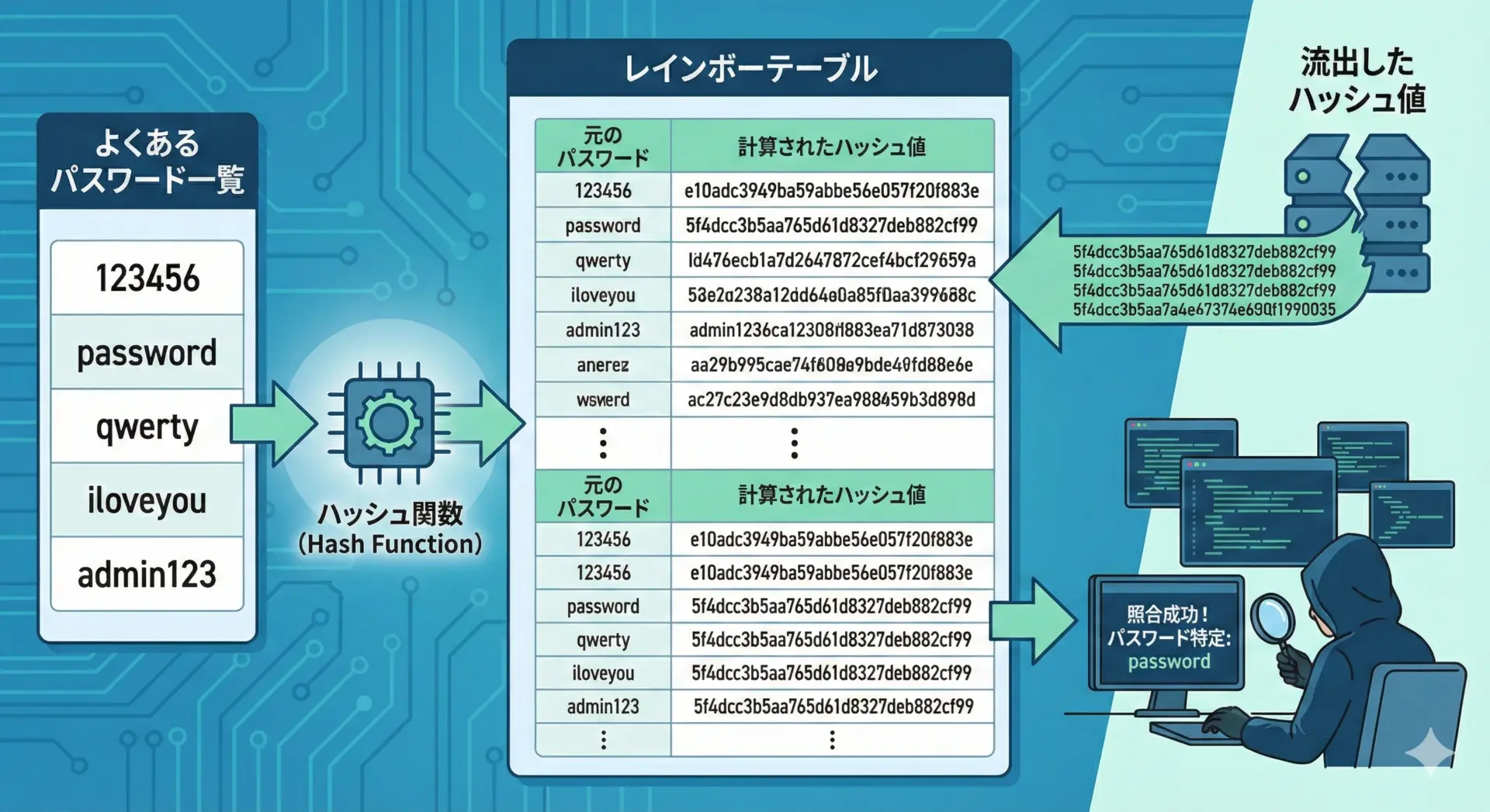 レインボーテーブル攻撃とは、よく使われそうなパスワードと、そのハッシュ値をあらかじめ大量に計算・保存しておき、攻撃時に照合する手法です。