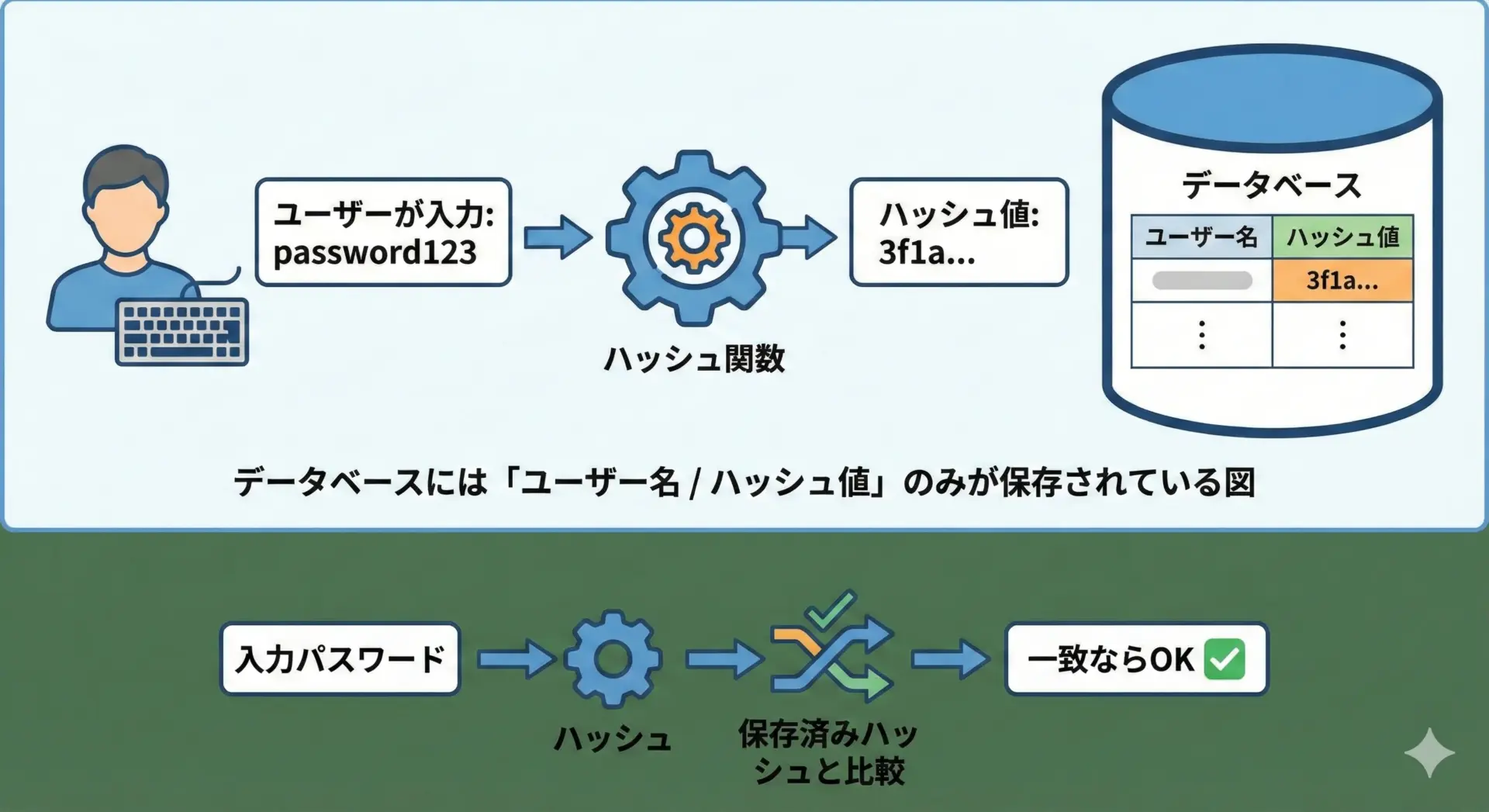 • パスワードは決して平文で保存せず、ソルト付きのハッシュとして保存するべきであること