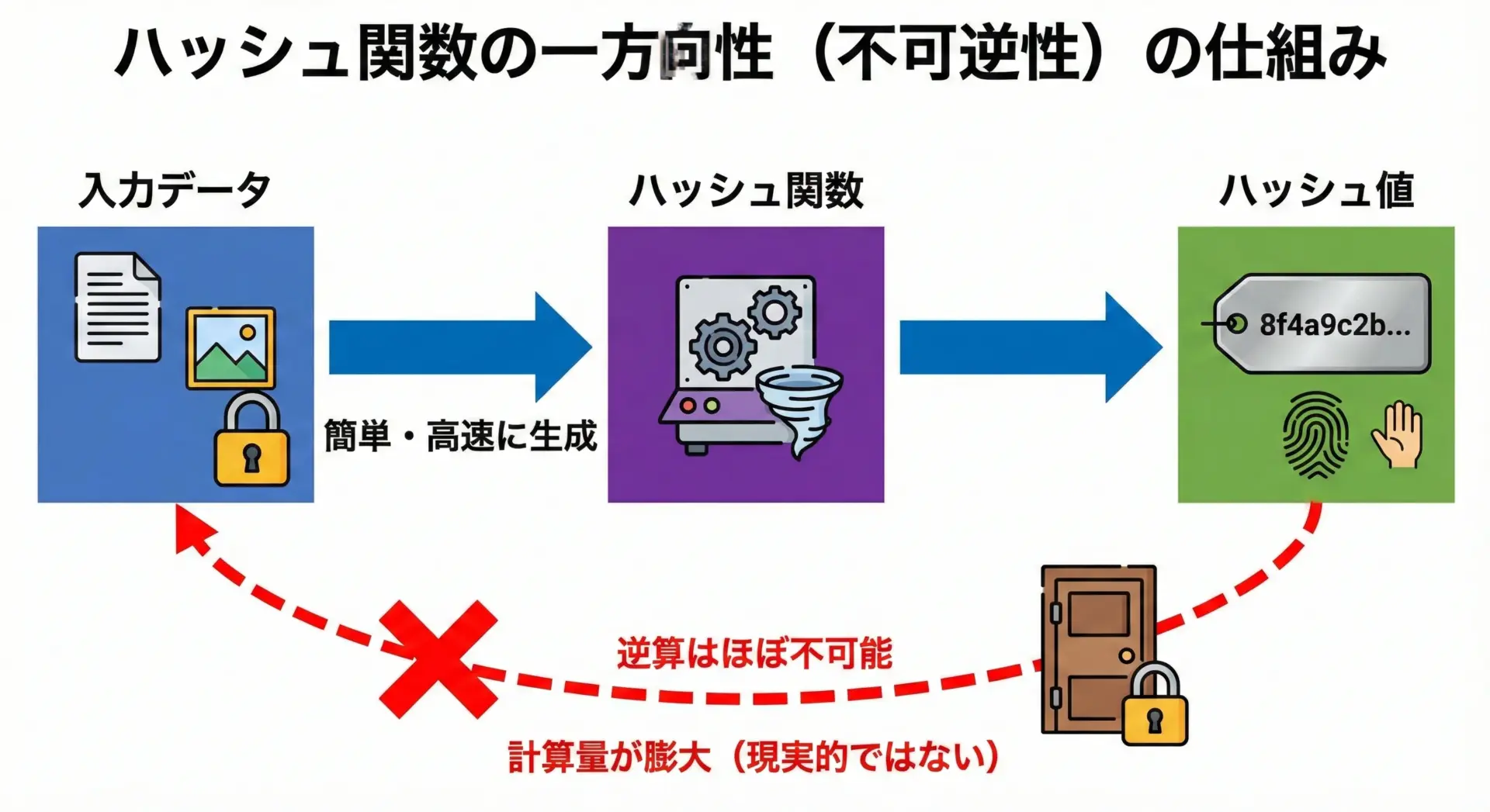 これは、入力からハッシュ値を計算するのは簡単だが、その逆(ハッシュ値から入力を特定する)は非常に難しいという意味です。
