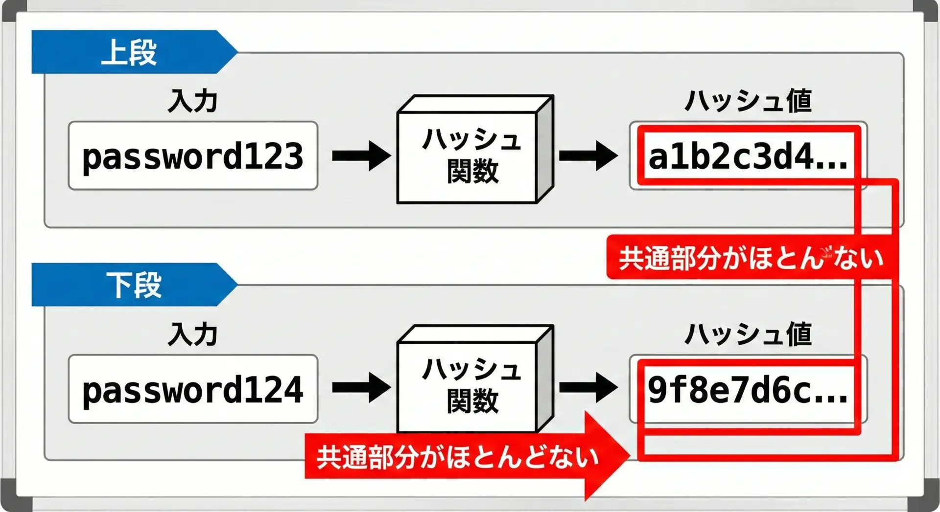人間の感覚では、password123password124は1文字しか違わないので「似たような値」になりそうですが、ハッシュ関数ではそうはなりません。
