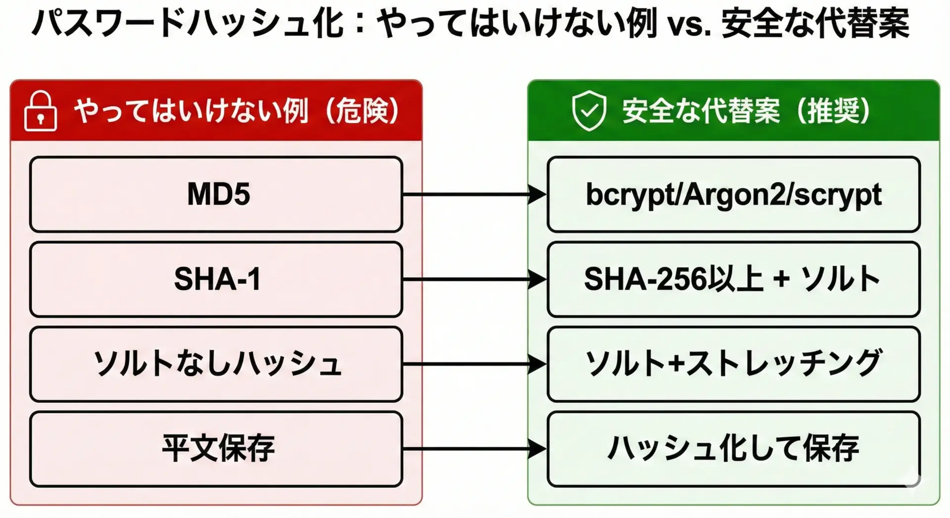 パスワード保存には、計算コストをわざと重くした専用の関数を使うのが基本です。