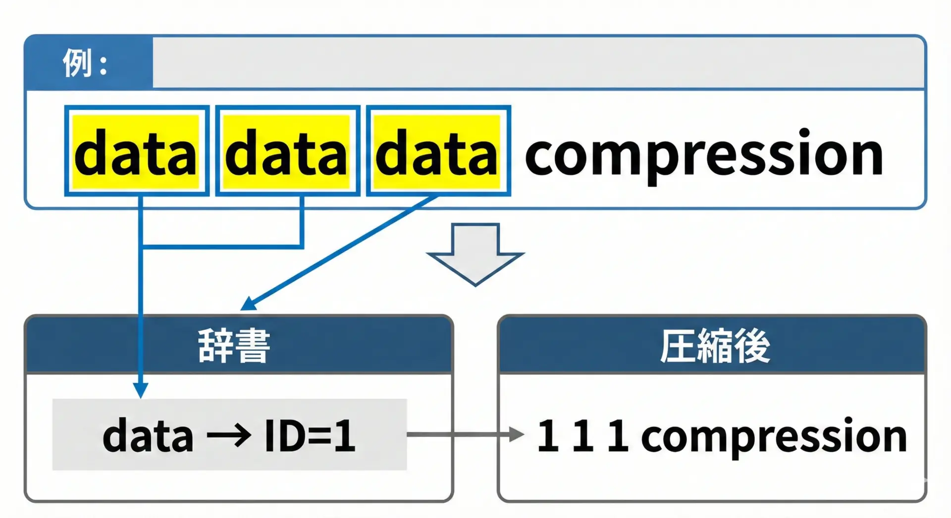 よく出現する文字列に「ID」を割り振り、そのIDで参照することで全体のサイズを減らします。