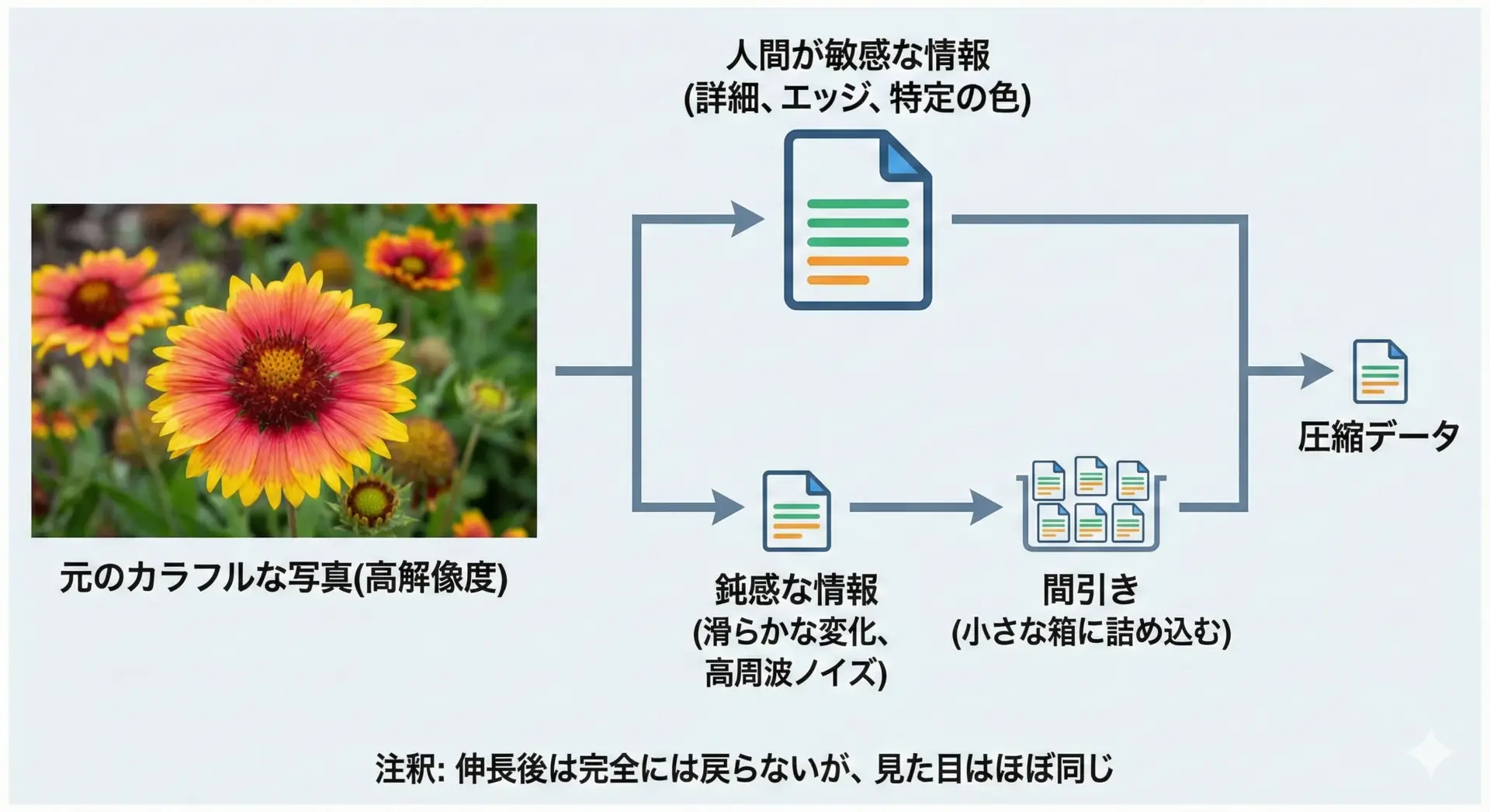ここで重要なのは、人間の知覚特性を利用して「失っても気づきにくい情報」を削る点です。