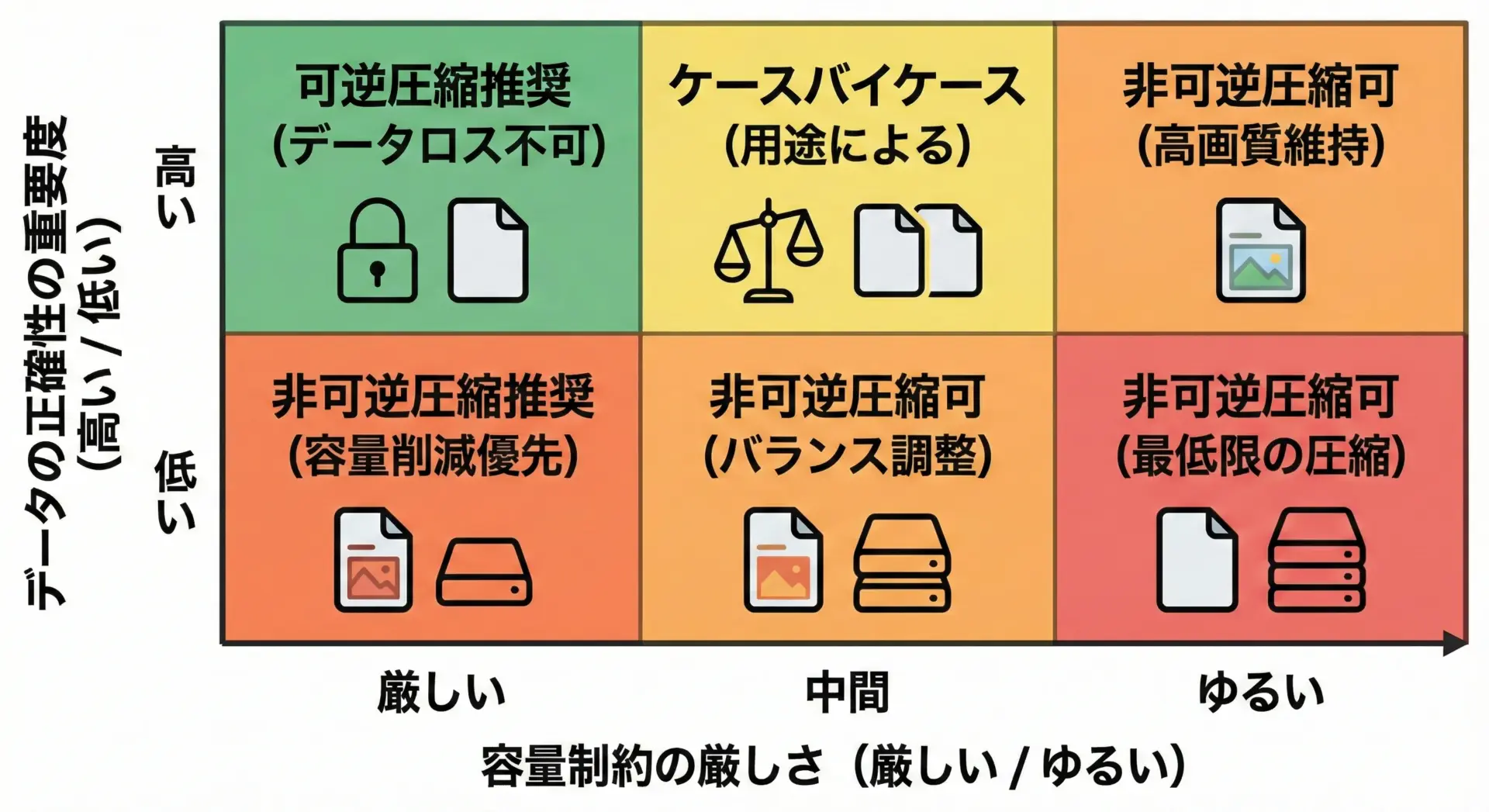 可逆圧縮と非可逆圧縮の使い分けは、次の観点で判断すると整理しやすくなります。