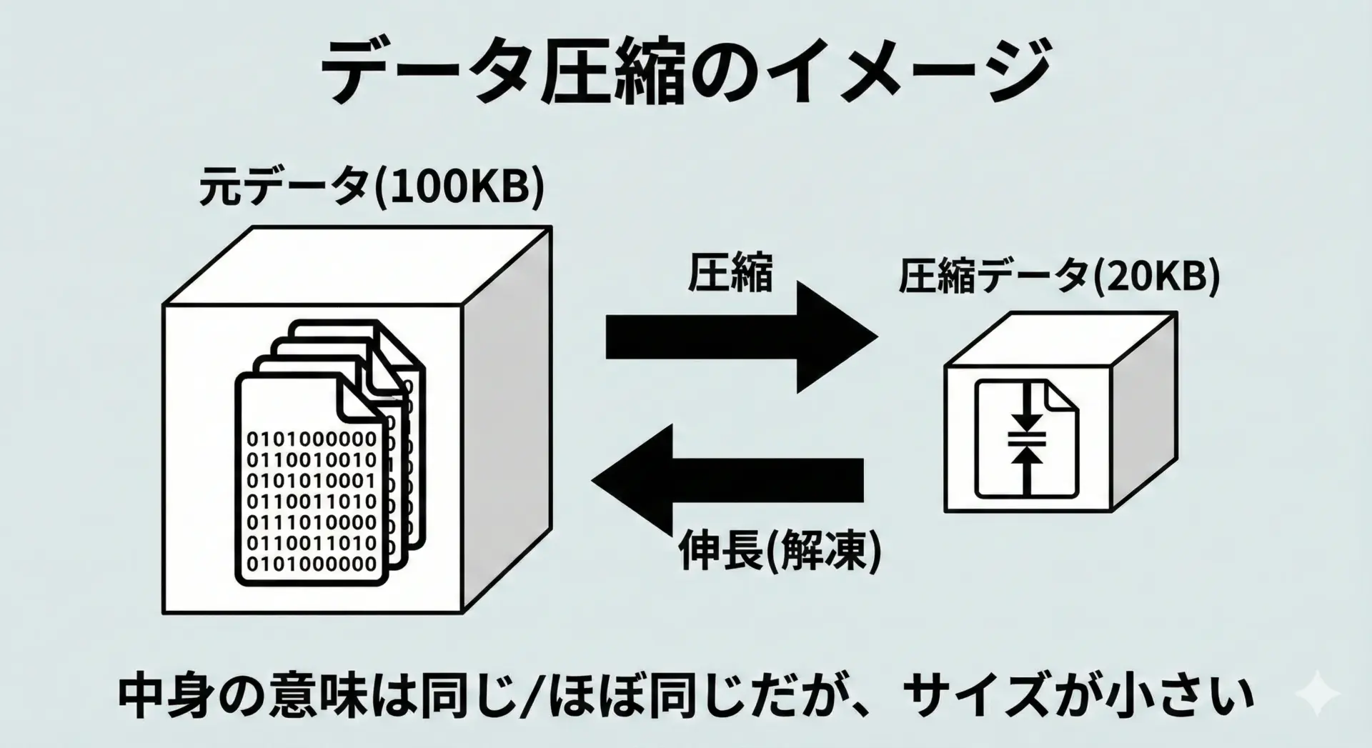 データ圧縮とは、元の情報をできるだけ保ったまま、必要なデータ量(ビット数やバイト数)を小さくする技術のことです。