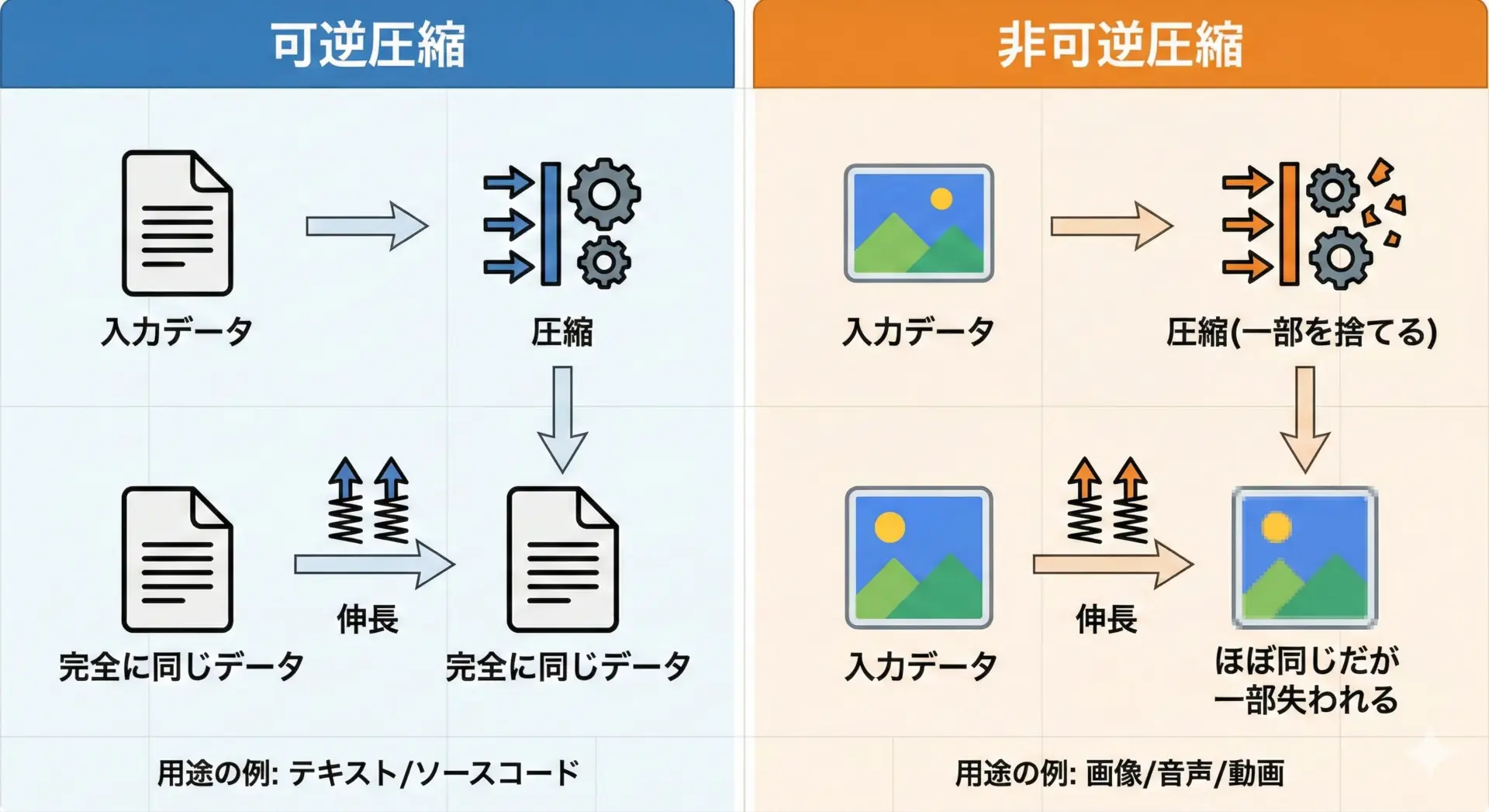 可逆圧縮(lossless)は、元のデータを1ビット単位で正確に復元できる圧縮方式であり、テキスト、ソースコード、ログ、バックアップなど、正確性が最重要なデータに必須です。