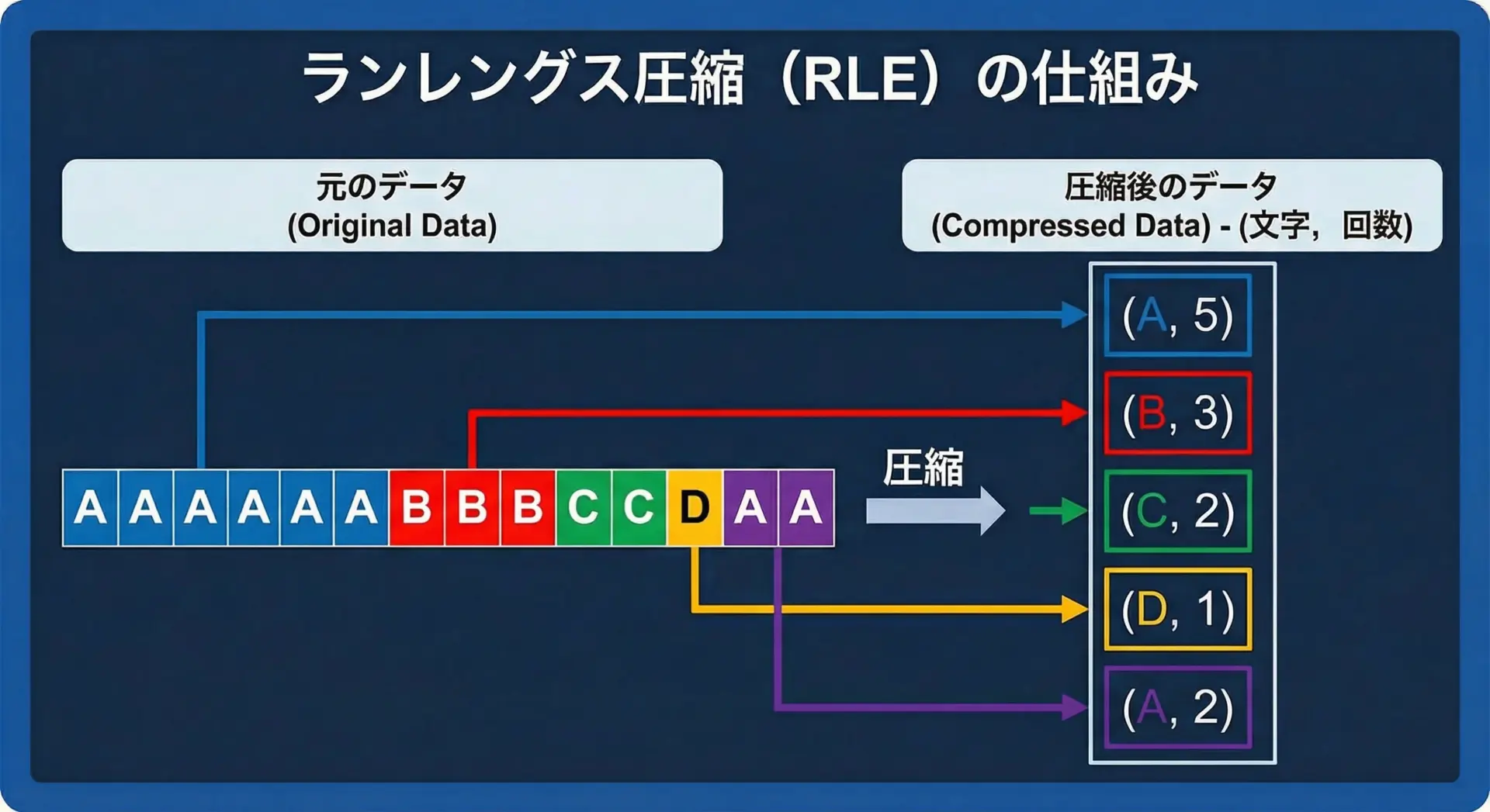 同じ文字が続く箇所を(文字, 回数)のペアに置き換えることで、繰り返し部分を短く表現します。