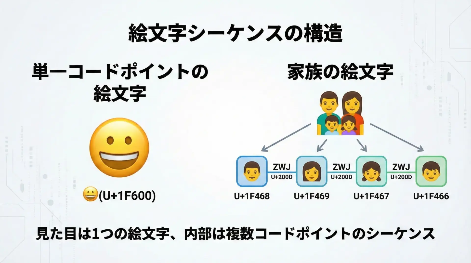 本記事では、その中でも理解のハードルになりやすいサロゲートペア・結合文字・絵文字について、図解とサンプルコードを交えながら、実践的な観点で整理していきます。