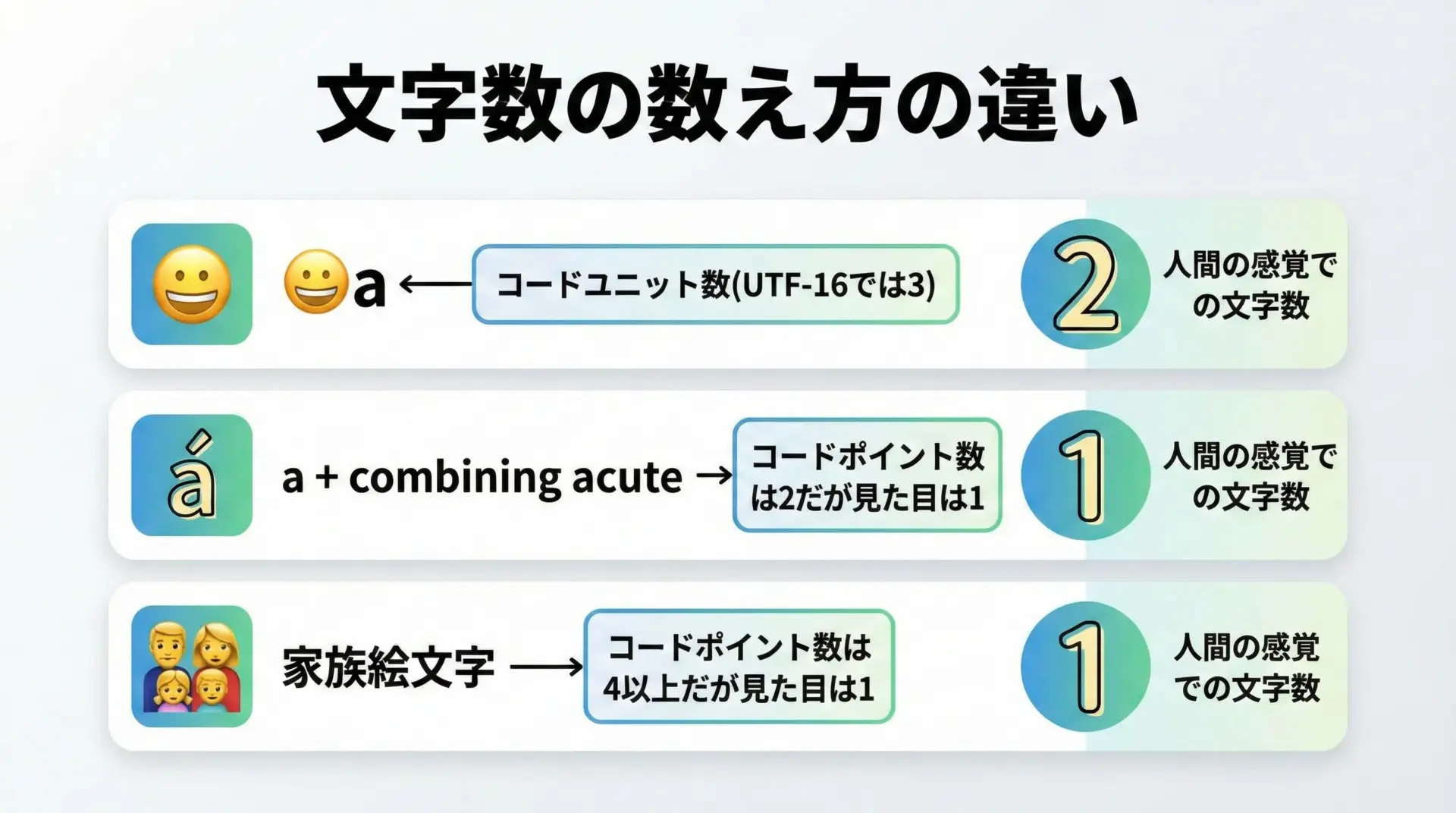 Unicodeの世界では、「1文字 = 1コードポイント = 1コードユニット」ではないことが、サロゲートペア・結合文字・絵文字の登場によってはっきりと表れています。