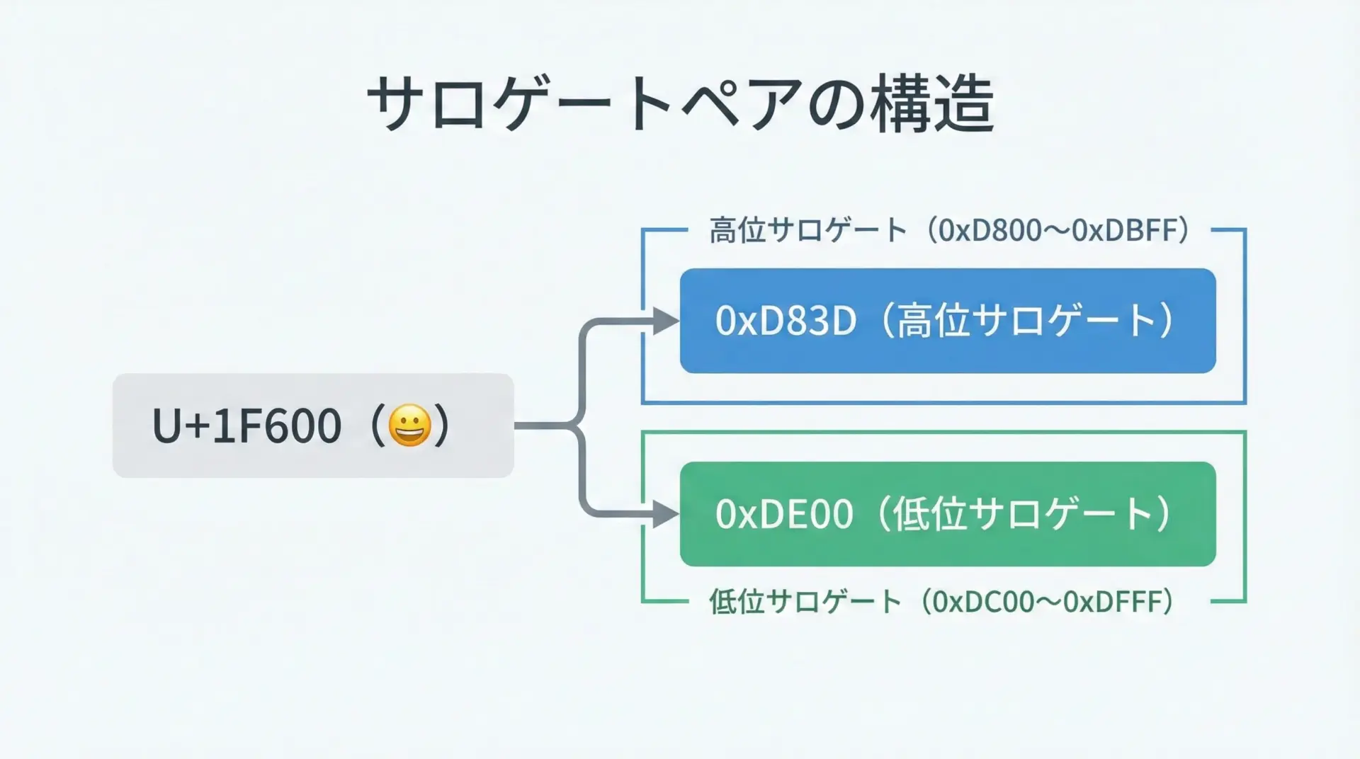 例えば絵文字😀(U+1F600)は、UTF-16では次の2つのコードユニットで表現されます。