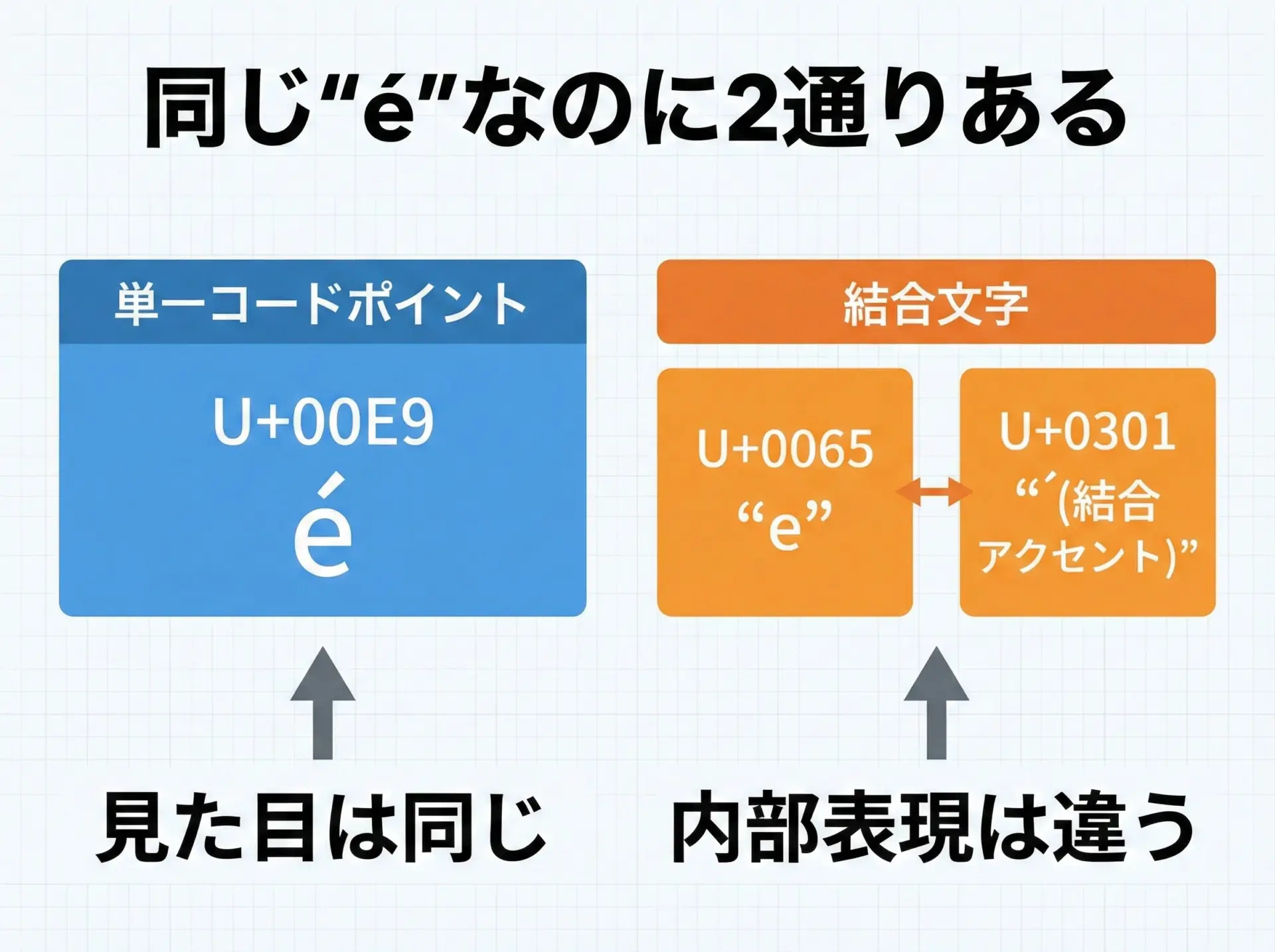 ユーザーから見るとどちらも同じ「é」に見えますが、バイト列が異なるため、そのまま比較すると「違う文字列」と判定されてしまいます。