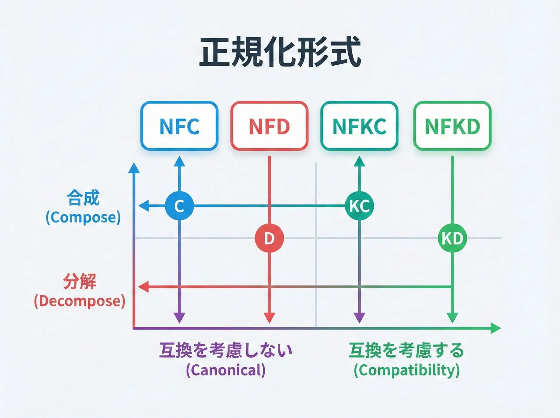 Unicode正規化は、次の2軸で分類されます。