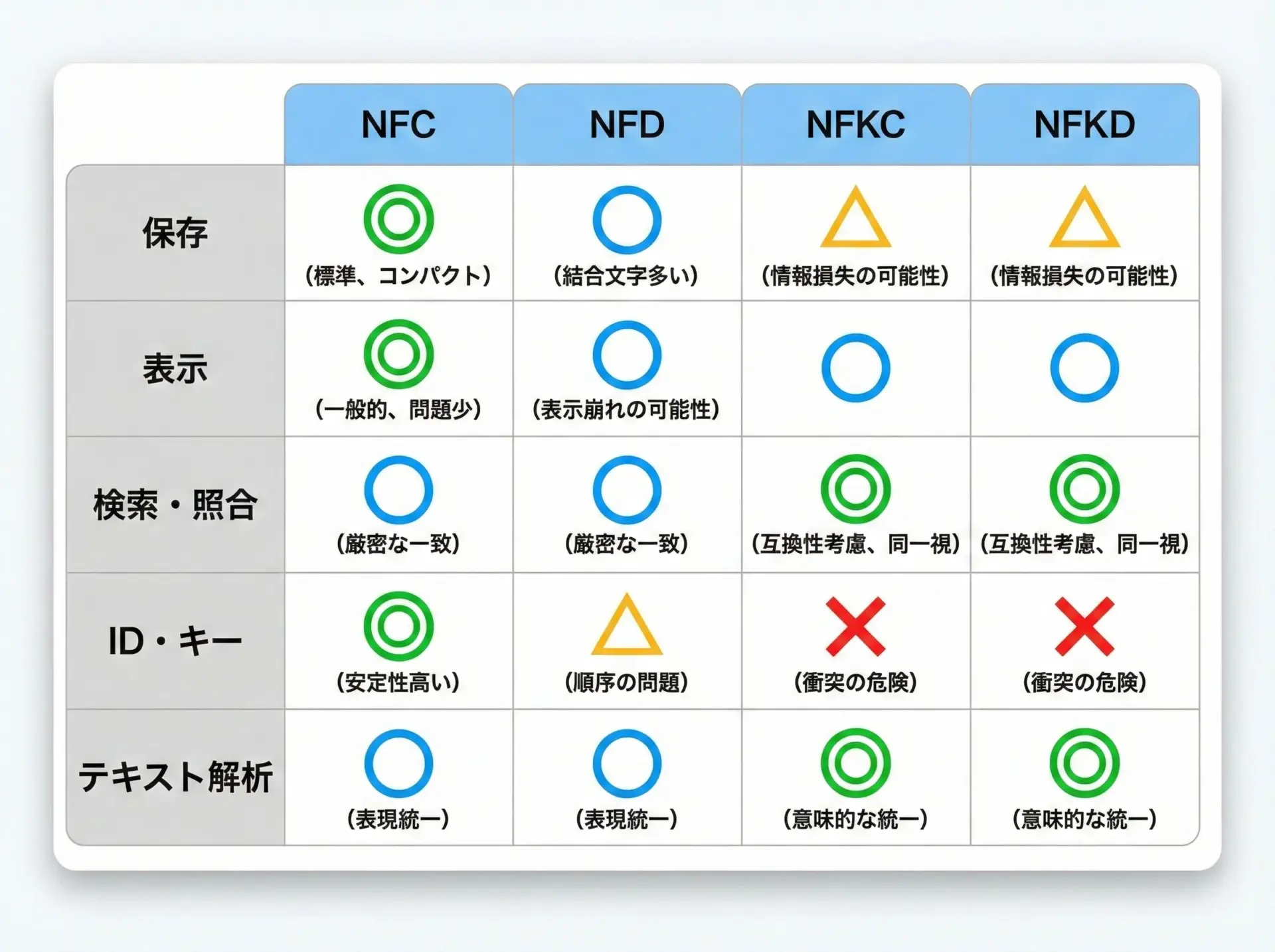 | NFKC | 合成(Compose) | する | 見た目が近い文字を1つに寄せる。照合・検索特化 |