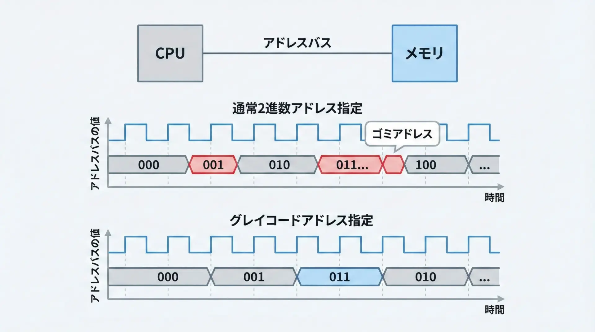 メモリや外部デバイスにアクセスする際に使われるアドレス線でも、グレイコードが使われることがあります。