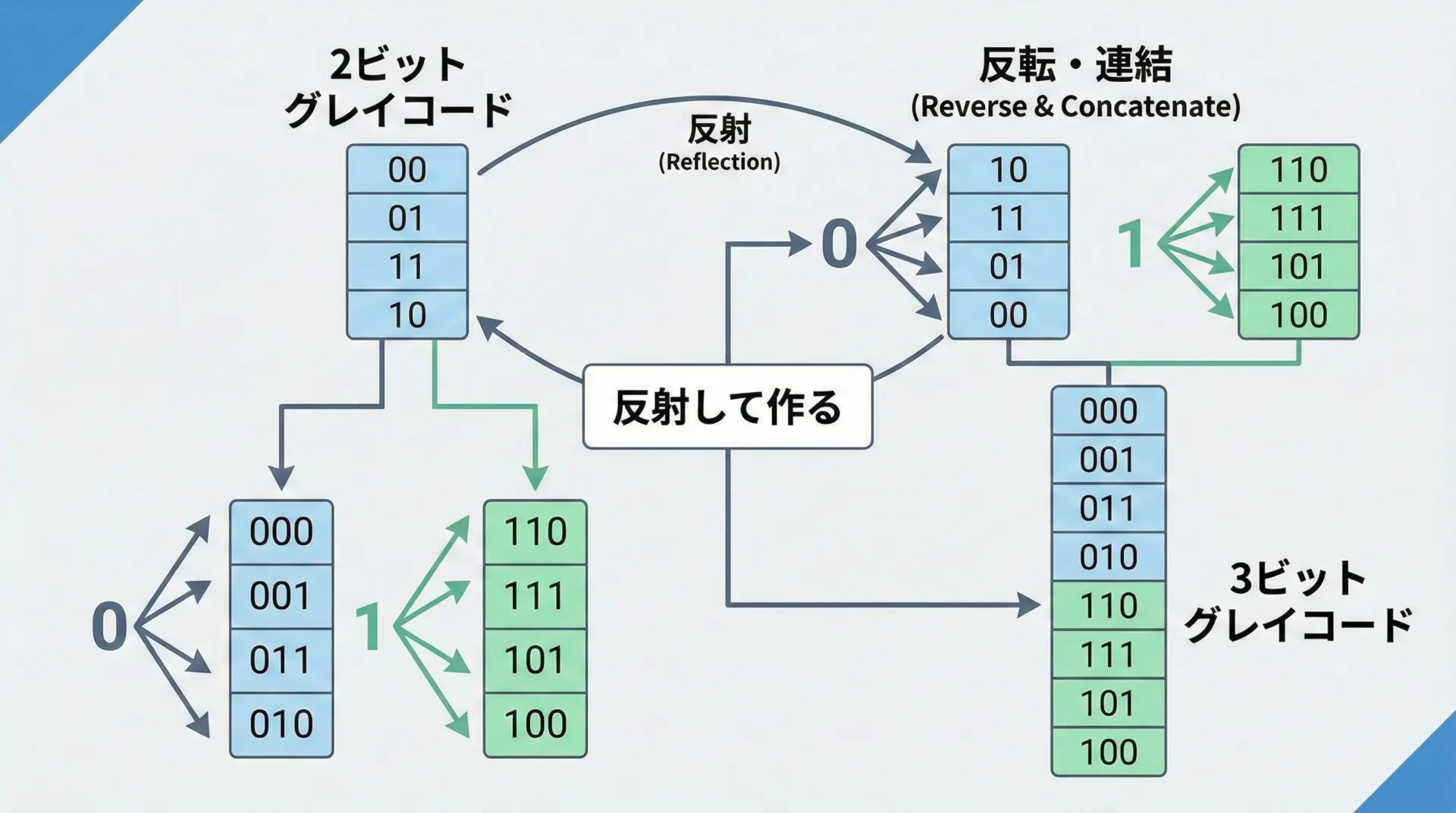 グレイコードは反射(reflection)というシンプルな手順で構成できます。