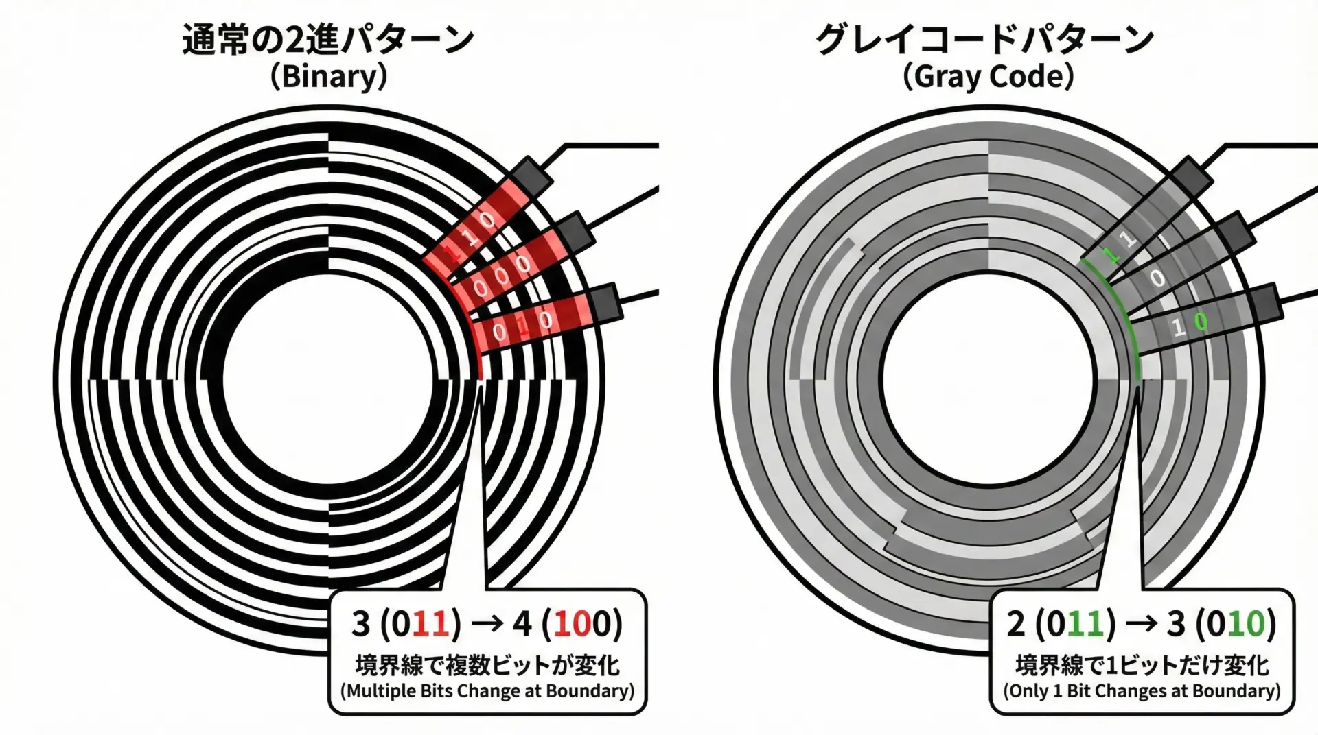 通常の2進数パターンを使うと、ある角度の境界付近で複数ビットが同時に変化します。