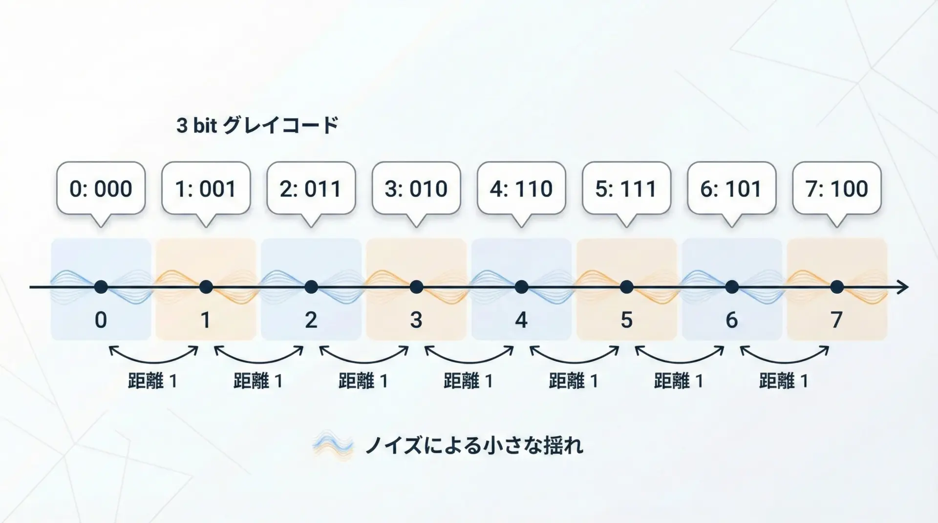 グレイコードは、隣接するコード同士のハミング距離(異なるビット数)が1という性質を持っています。