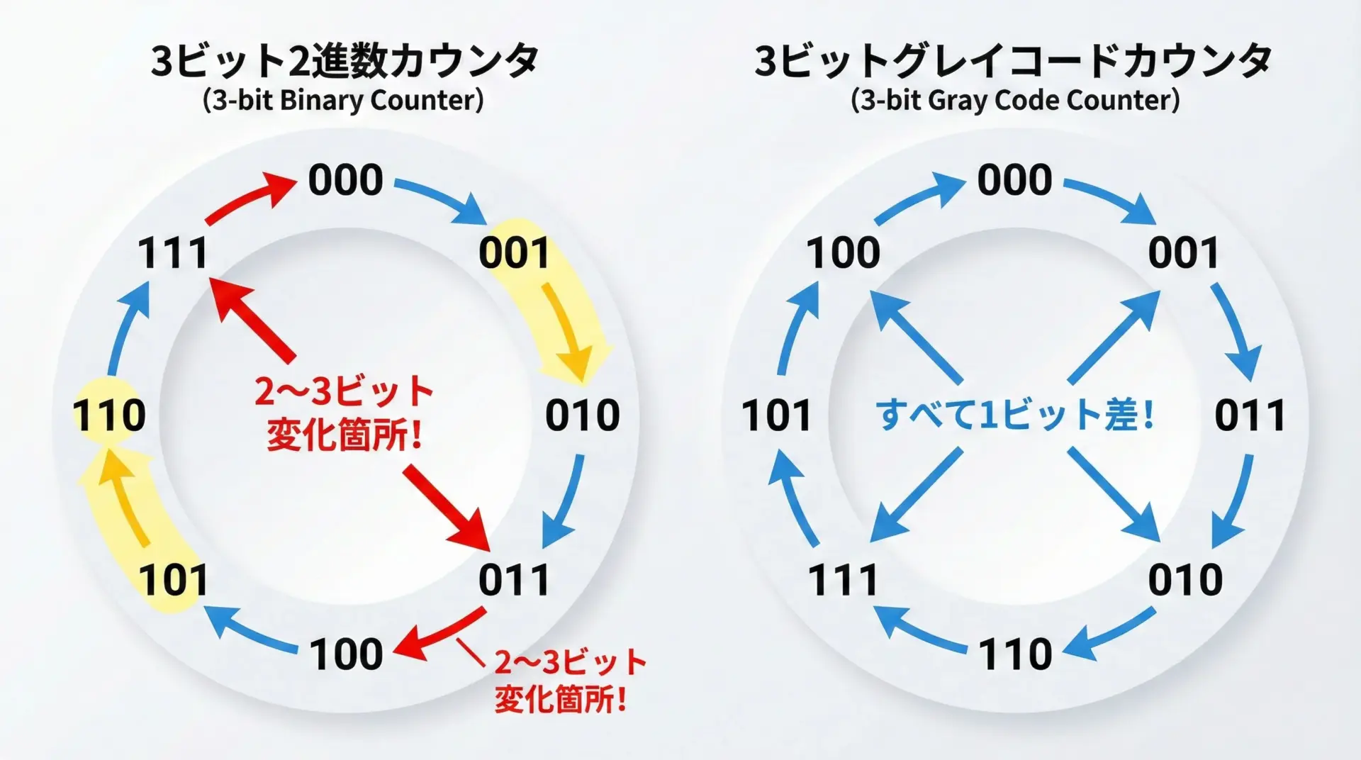 - 通常の2進カウンタ: 値によっては「大ジャンプ」が起きる(複数ビットが変化)