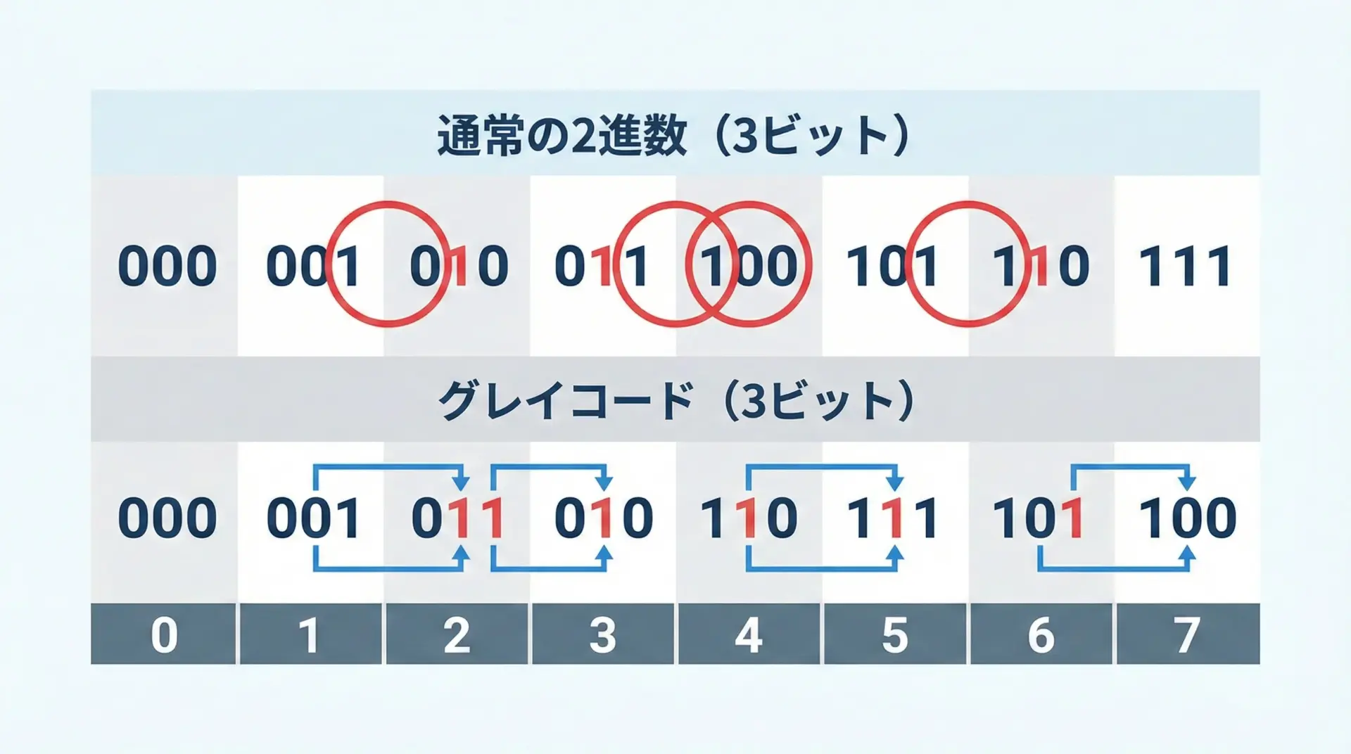 一方、通常の2進数では、3(011)から4(100)に変わるときのように、3ビットすべてが同時に変化する箇所も存在します。