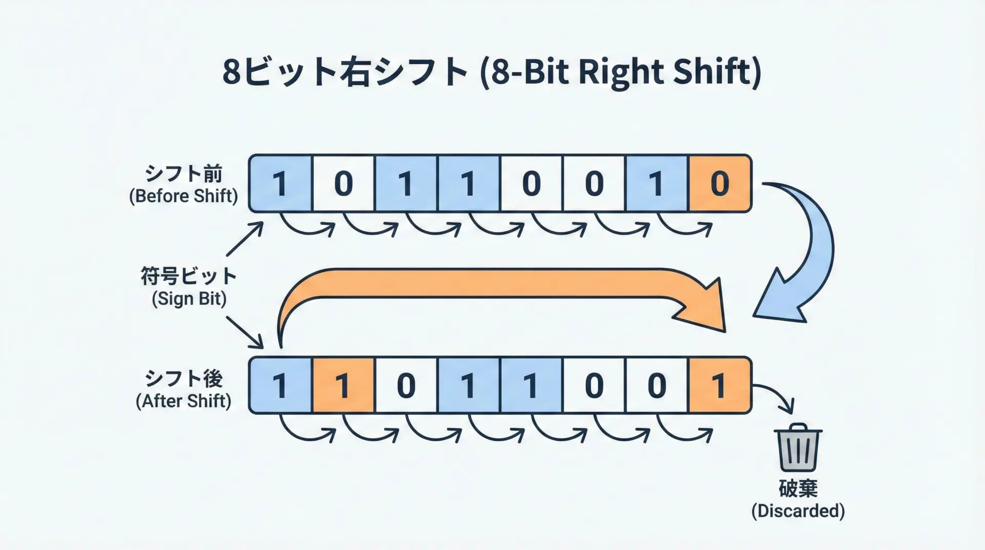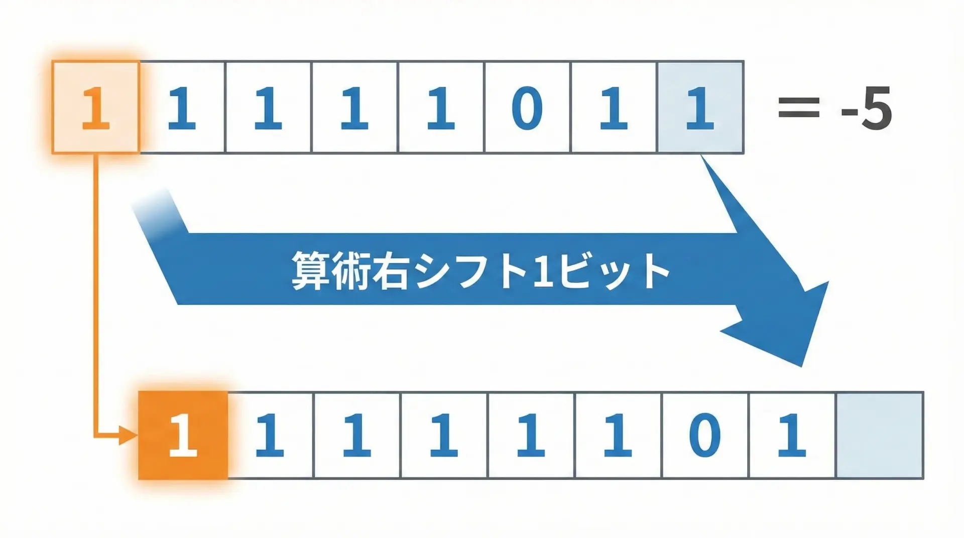 算術右シフトでは、この符号ビットを維持することが重要になります。