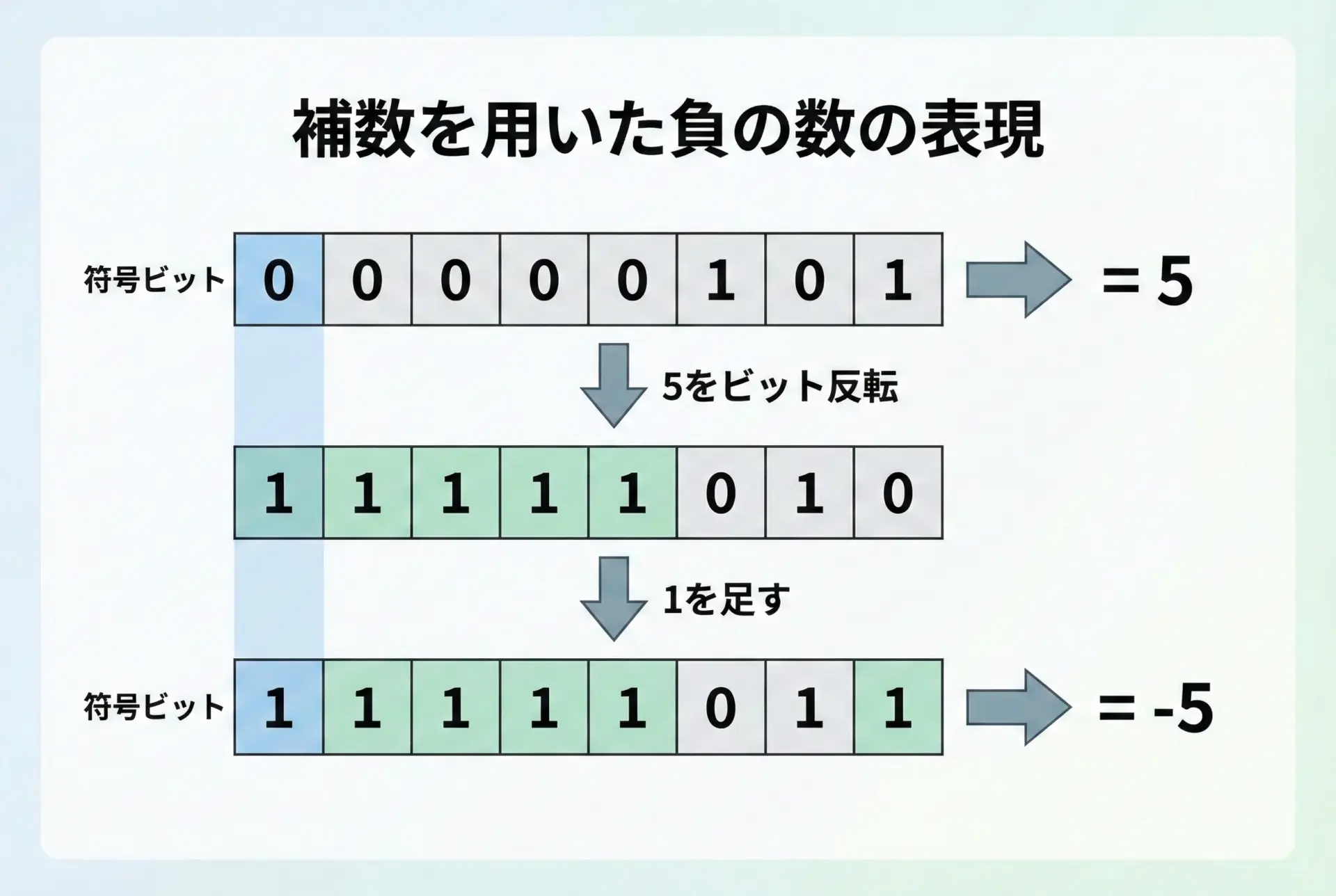 | 負の数 -5 | 11111011 | -5(2の補数) |