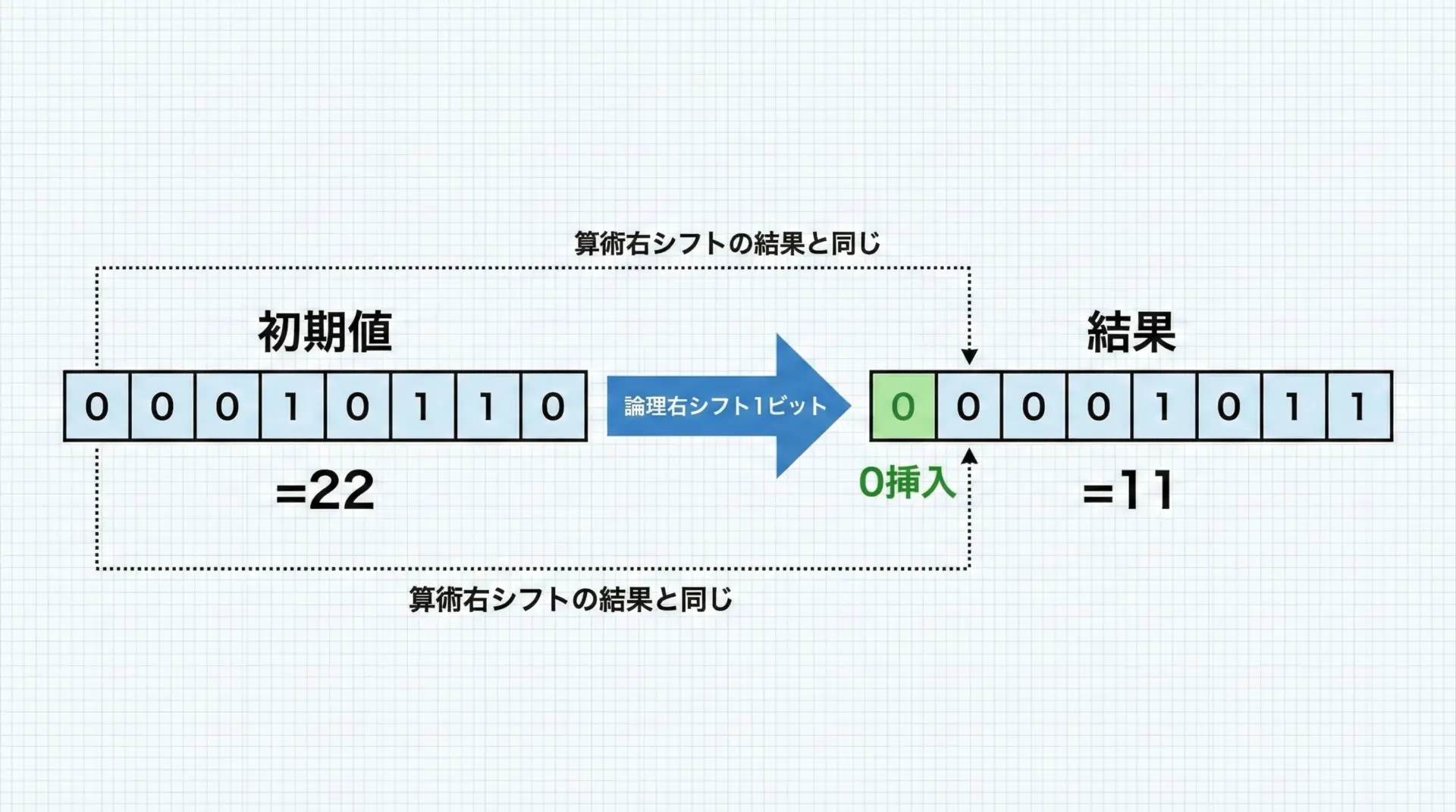 これらでは、最上位ビットを必ず0で埋める論理右シフトのほうが意図した動きに近くなります。