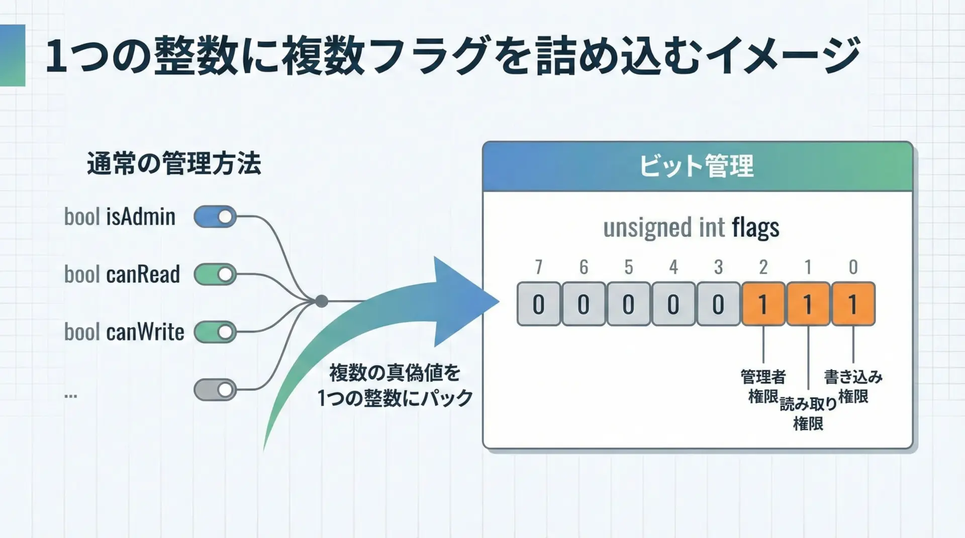特にフラグ管理では、複数のオン・オフ状態を1つの整数型変数にまとめて表現できるため、コードがシンプルになり、メモリ効率やパフォーマンスも向上しやすくなります。