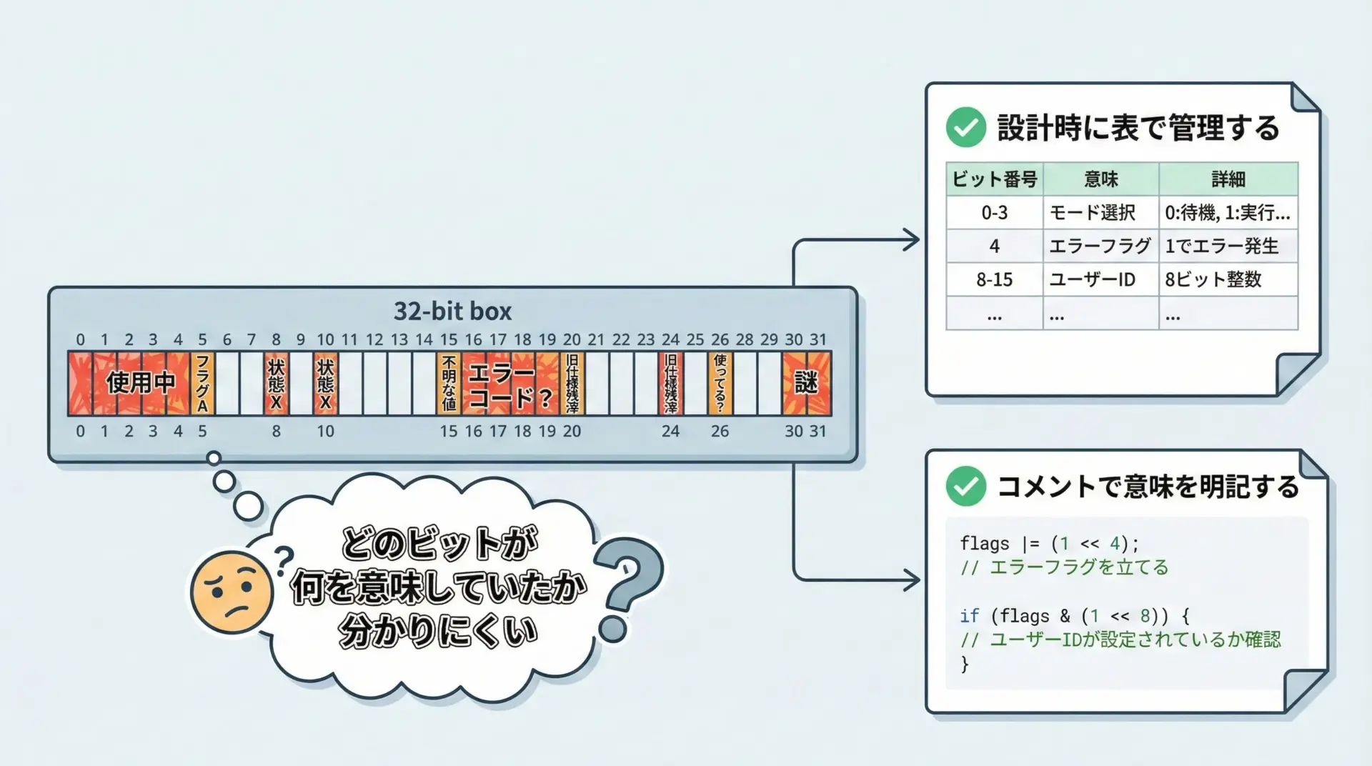 - ビットが増えすぎると、「どのビットが何の意味だったか」を把握しにくくなる