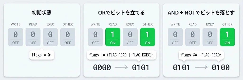ビット演算子を使ったフラグ管理は、「複数のON/OFF状態を1つの整数で表現する」テクニックです。