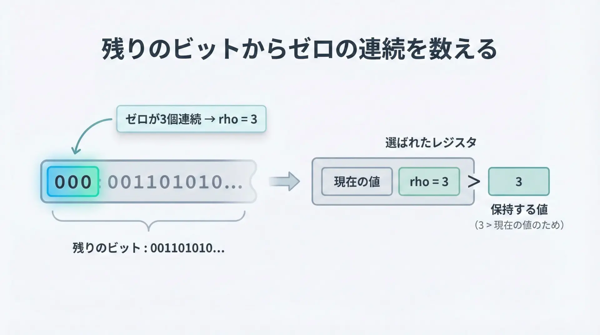 その中核となるアイデアは、ハッシュ値の先頭に現れる0の連続長から、統計的に要素数を推定するというものです。
