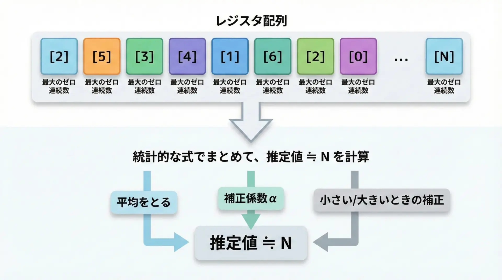 実際の公式は少し複雑ですが、考え方としては「各レジスタが観測したゼロ連続長から、そのレジスタに割り当てられた要素数を推定し、それらを合成して全体の要素数を推定する」と捉えると理解しやすくなります。