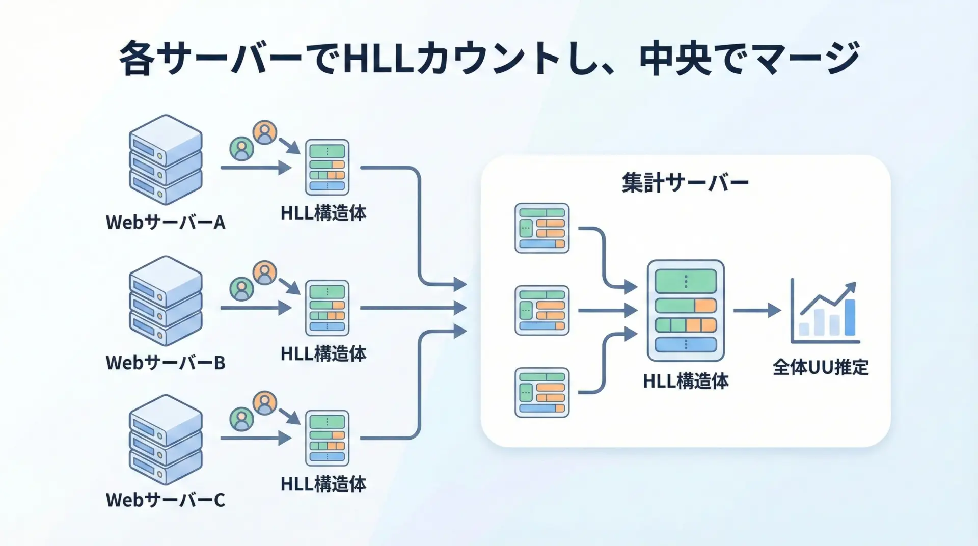 - 後から3つのHLLをマージして、全体のユニークユーザー数を推定