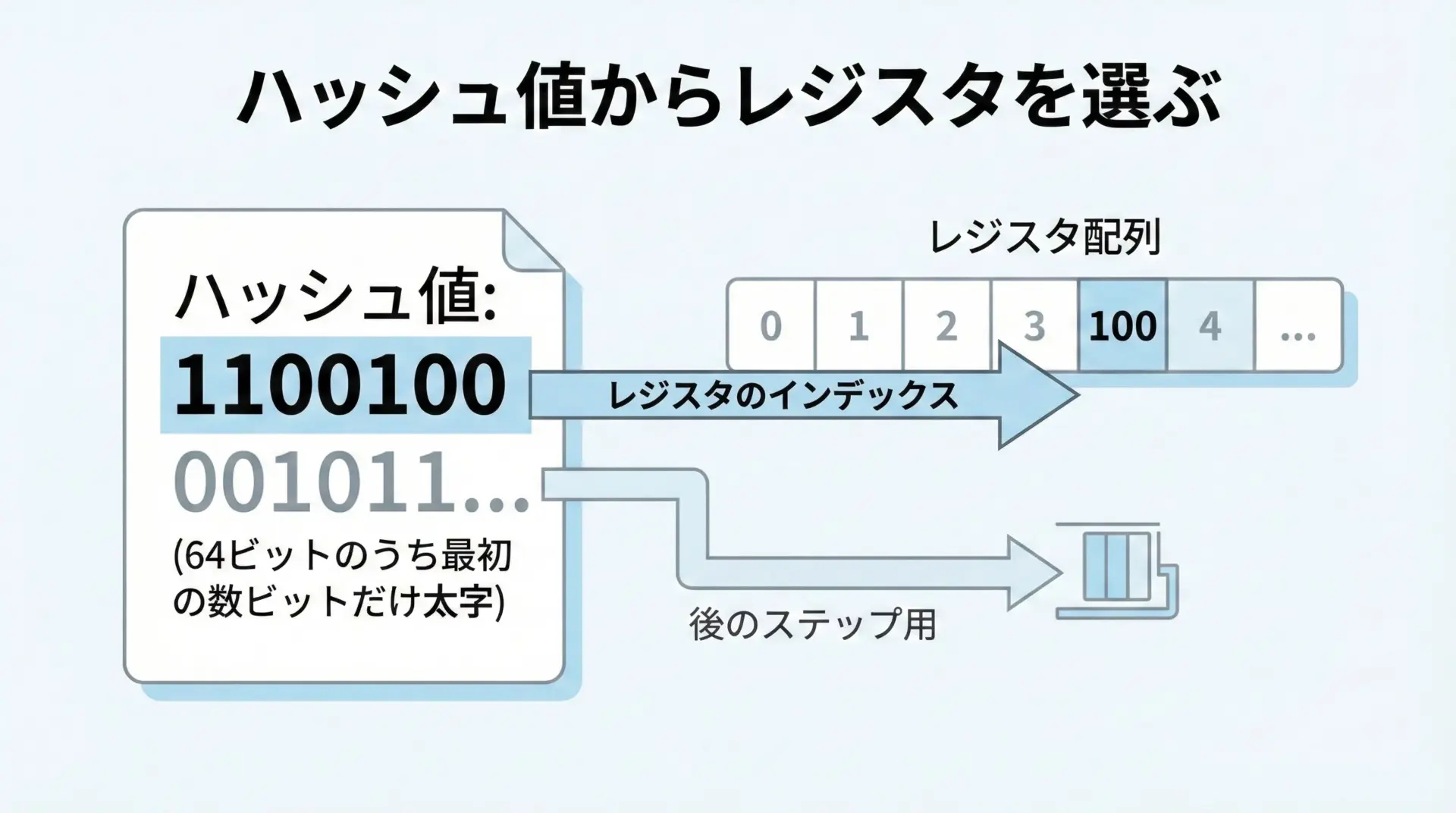 このインデックス決定により、要素はランダムに各レジスタへ振り分けられます。