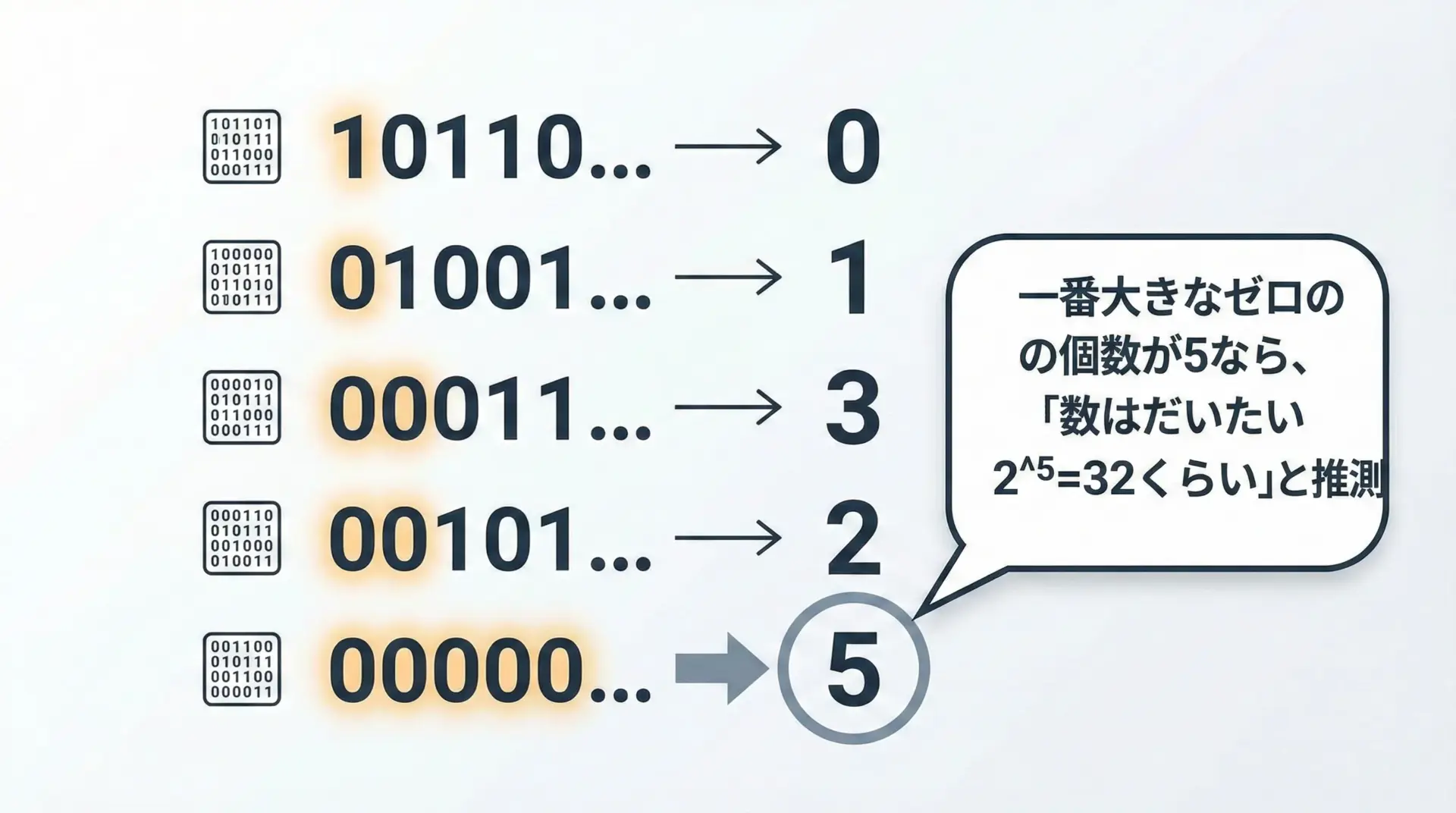 この図のように、ランダムなビット列がたくさんあるとき、先頭に長い0が出現する確率から、全体の個数を逆算することができます。