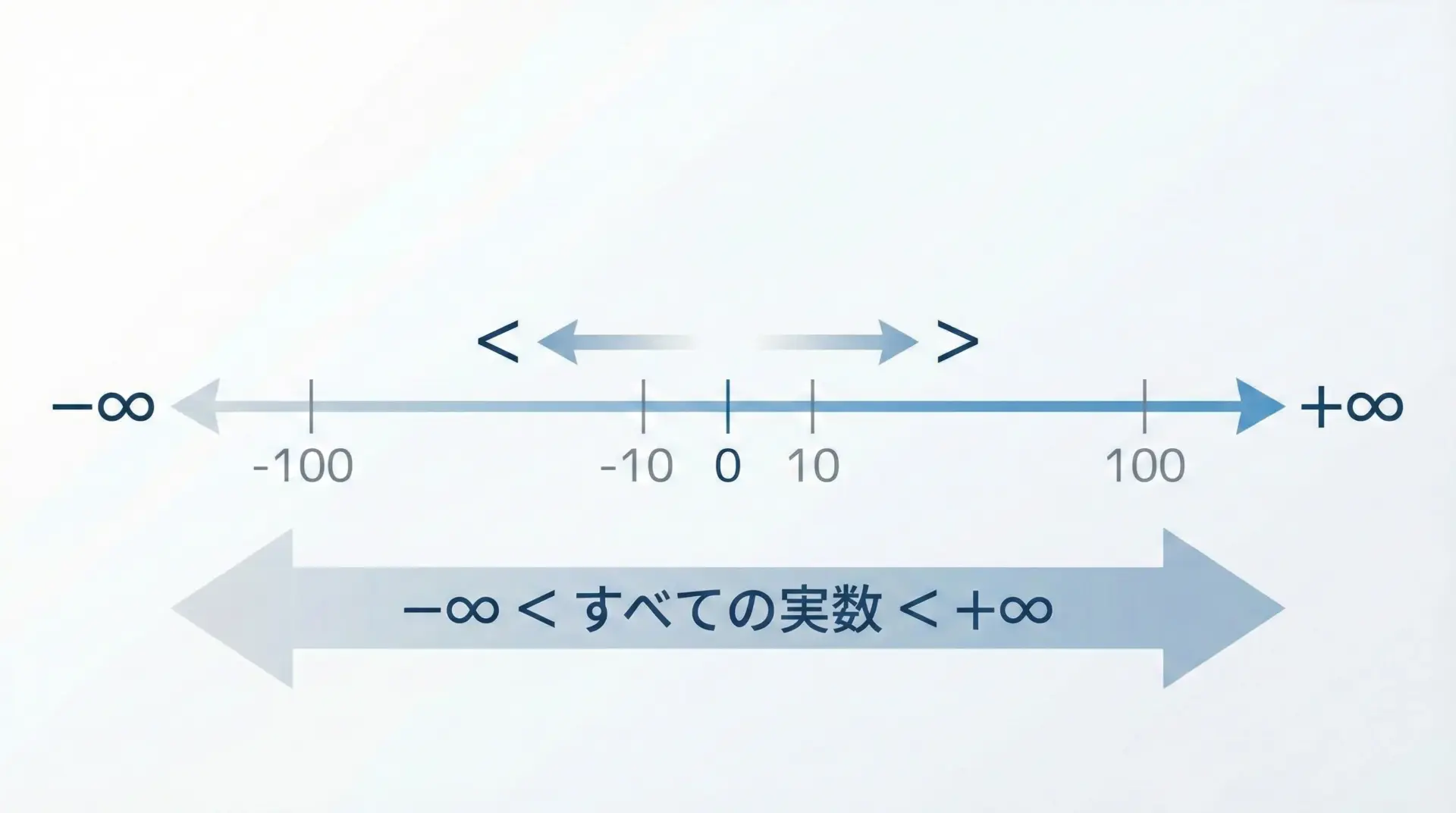 正の無限大・負の無限大は、実数ではなく「限りなく大きく(小さく)なる様子」を表す記号です。