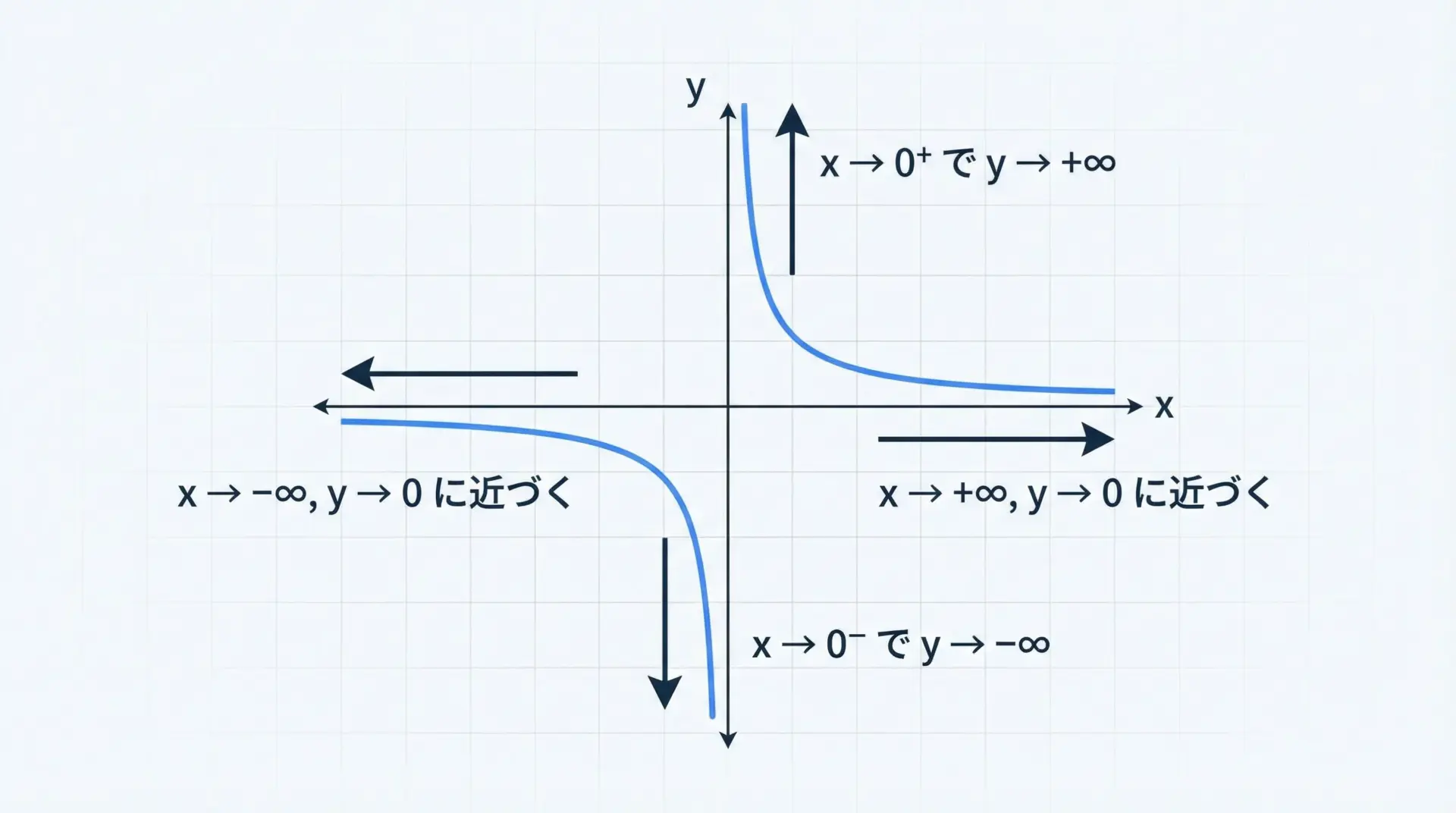 これは、x が正でも負でも絶対値が大きくなると 1/x は 0 に近づくという意味です。