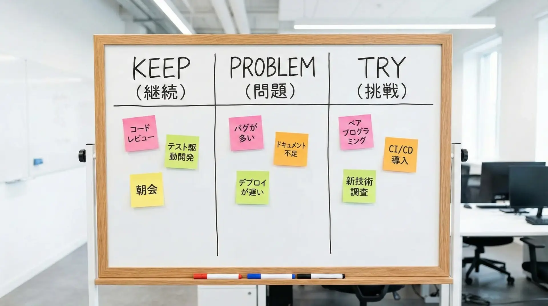 よく使われるフレームワークとして、「Keep / Problem / Try」があります。