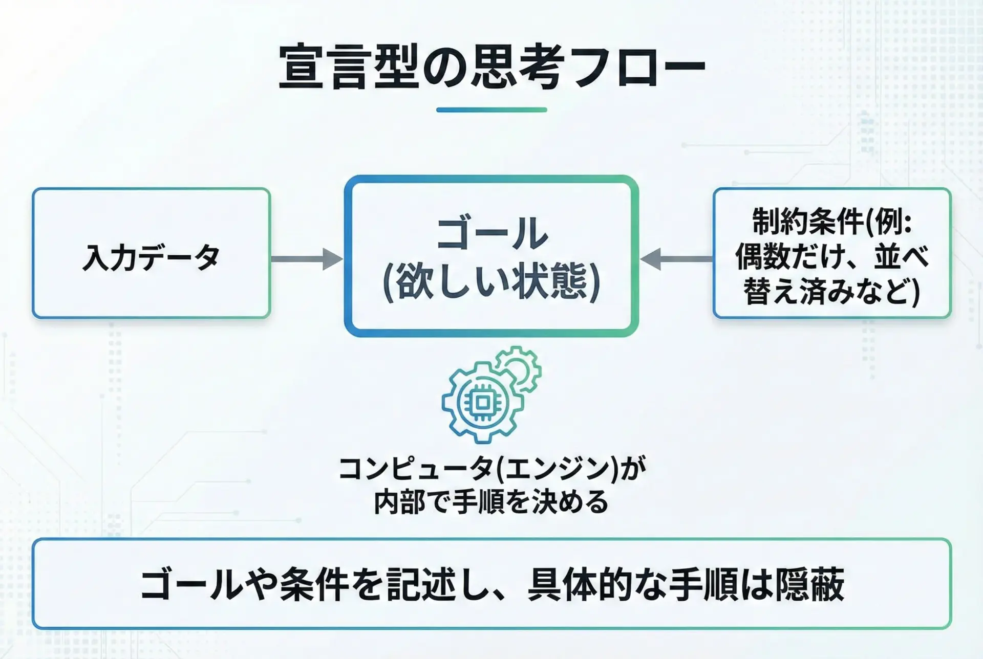 一方、宣言型では「こういう状態にしてほしい」「この条件を満たすものがほしい」とゴールや条件を伝え、その達成方法はコンピュータ側に任せるイメージです。