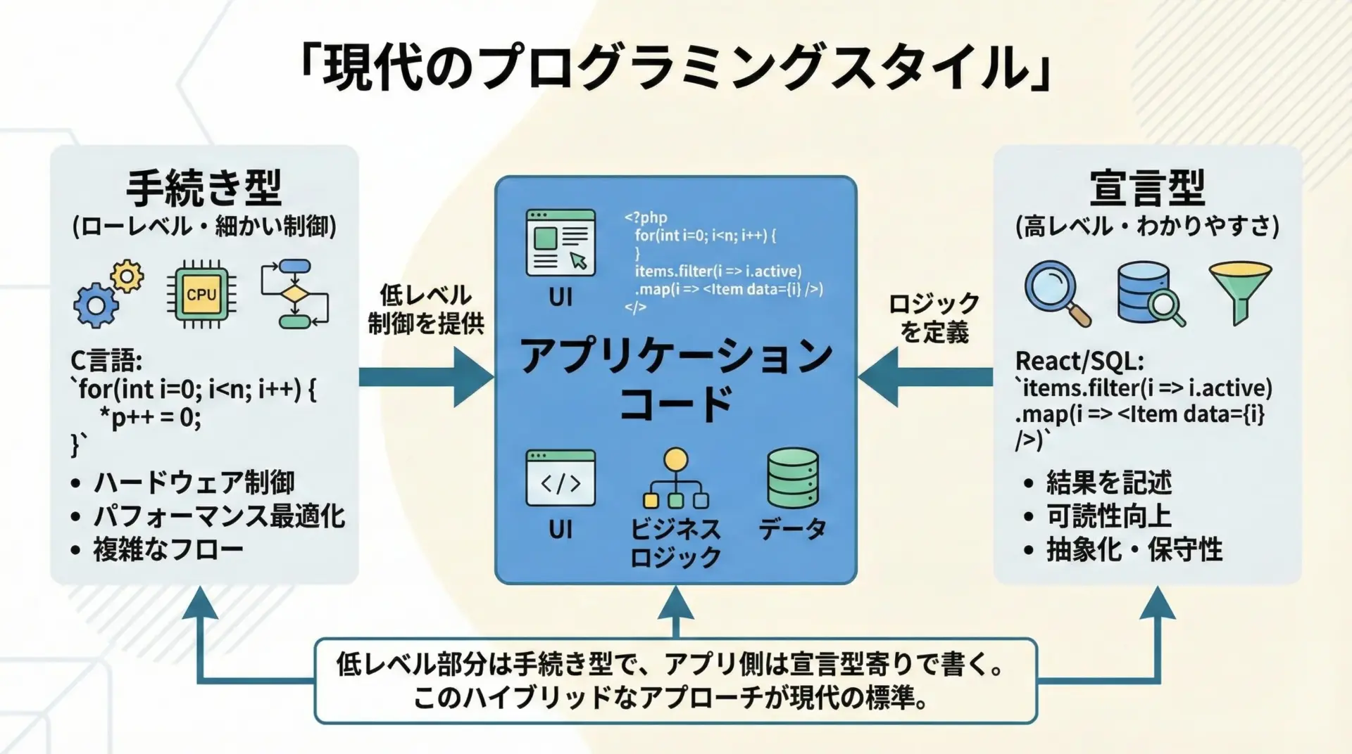 このように、「低レベルで細かい制御が必要な部分」では手続き型、「結果を分かりやすく表現したい部分」では宣言型、というように、適材適所で使い分けるのが実践的です。