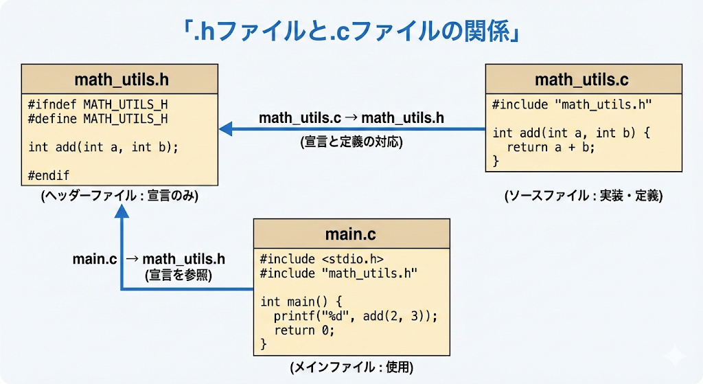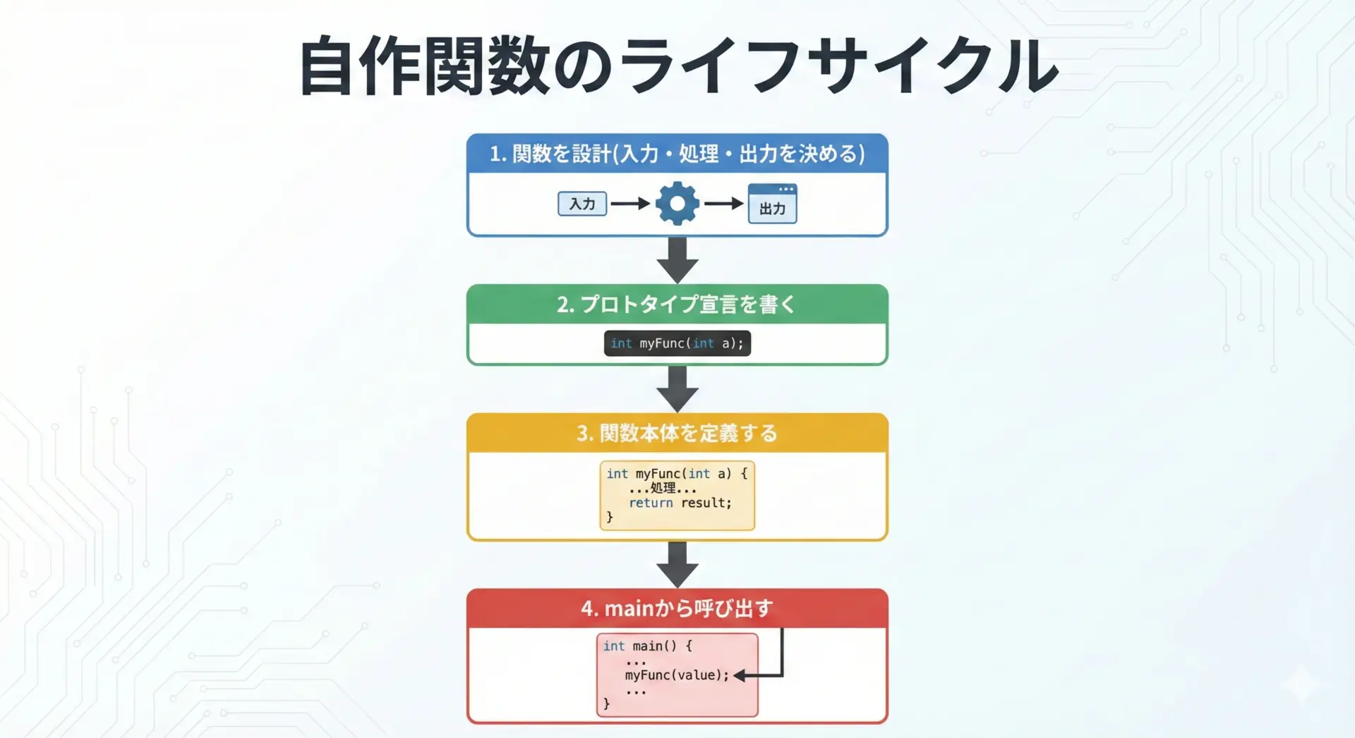 main関数を起点に、プロトタイプ宣言と定義を正しく書き分け、戻り値や引数の型・個数を意識して自作関数を設計することが重要です。