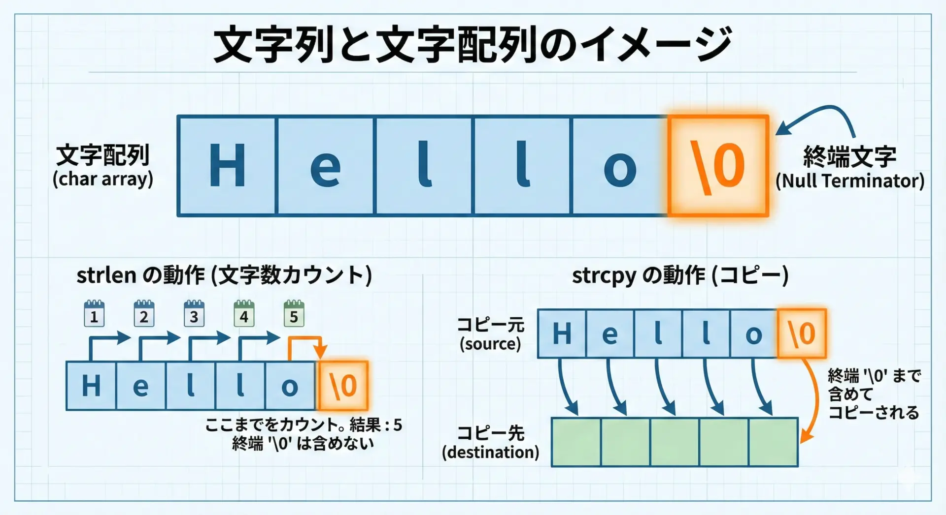 C言語では文字列を終端に'\0'(ヌル文字)を持つ文字配列として表現します。