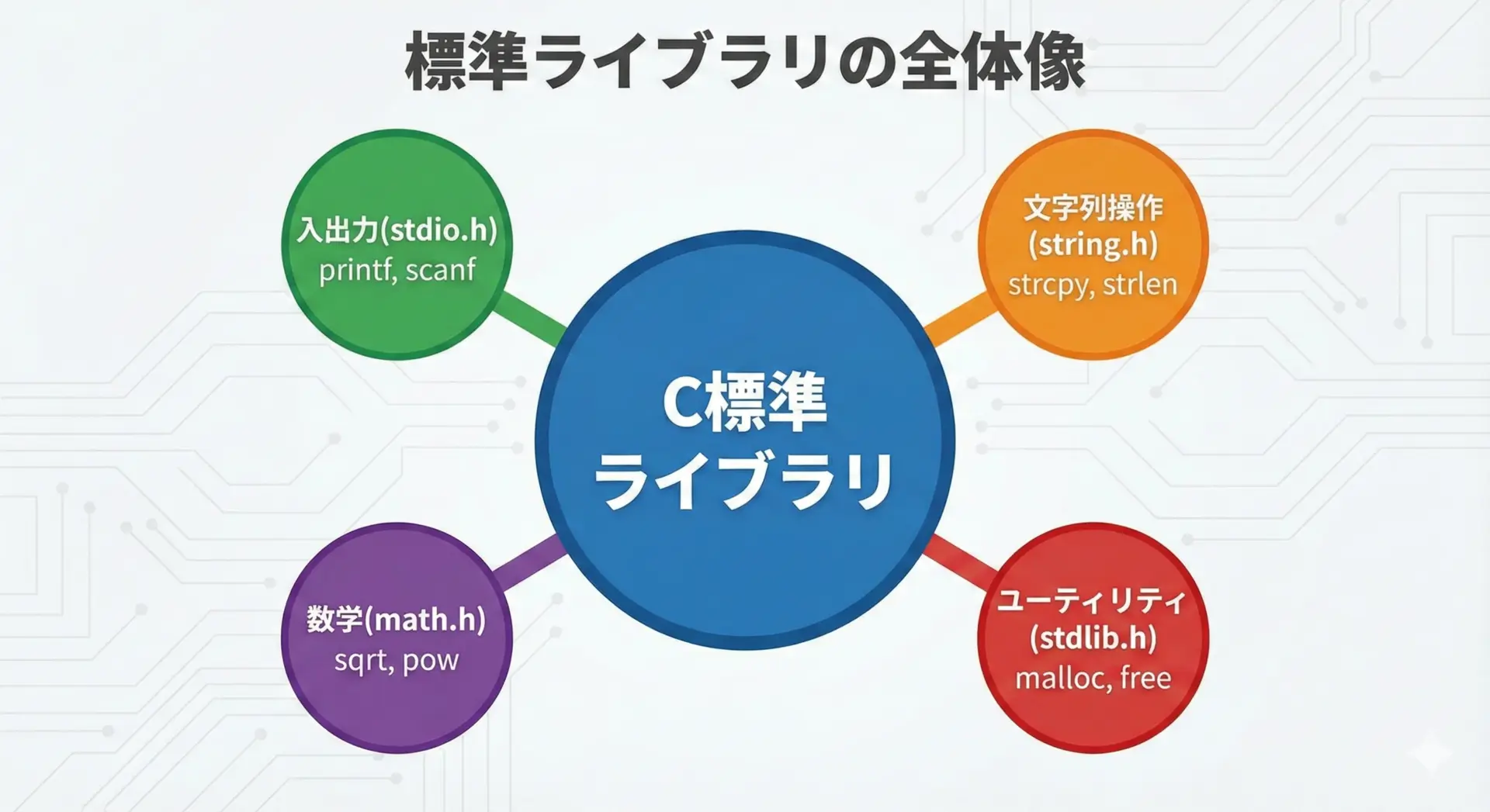 標準関数は、入出力、文字列処理、数学計算、メモリ管理といった多くの共通処理をカバーしています。