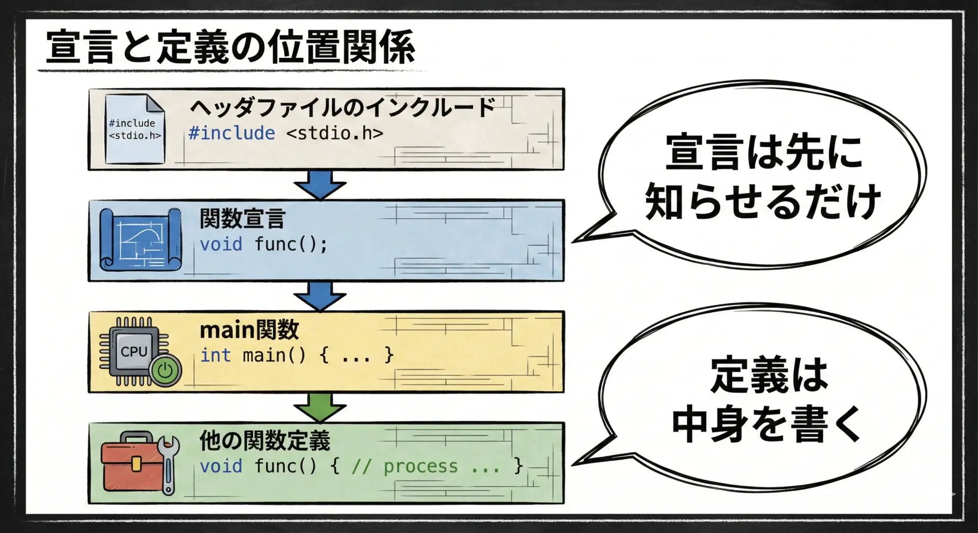 宣言を行っておけば、コンパイラは「この関数がどのような引数と戻り値を持つか」を理解した上で、後のコード(例えばmainの中)での呼び出しを正しくチェックできます。